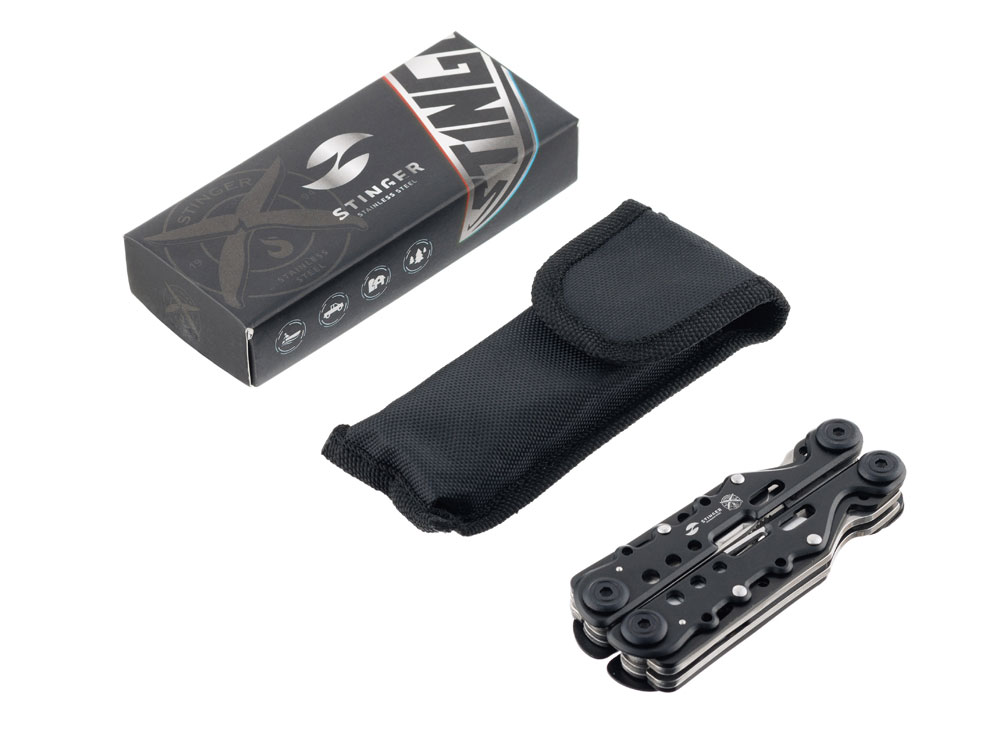 МНОГОФУНКЦИОНАЛЬНЫЙ ИНСТРУМЕНТ STINGER С НАБОРОМ ИЗ 13 ФУНКЦИЙ: 1. Острогубцы 2. Пассатижи 3. Кусачки 4. Лезвие большое плоское 5. Лезвие с серрейторной кромкой 6. Пила по дереву и металлу 7. Напильник по дереву и металлу 8. Отвёртка крестовая 9. Отвёртка шлицевая большая 10. Отвёртка шлицевая малая 11. Инструмент для снятия изоляции 12. Открывалка для бутылок 13. Консервный нож ХАРАКТЕРИСТИКИ: Материал инструментов: нержавеющая сталь 3Cr13 Материал рукояти: нержавеющая сталь Длина: 105 мм Ширина: 40 мм Вес: 230 г В комплекте: чехол из синтетического материала Упаковка: картонная коробка