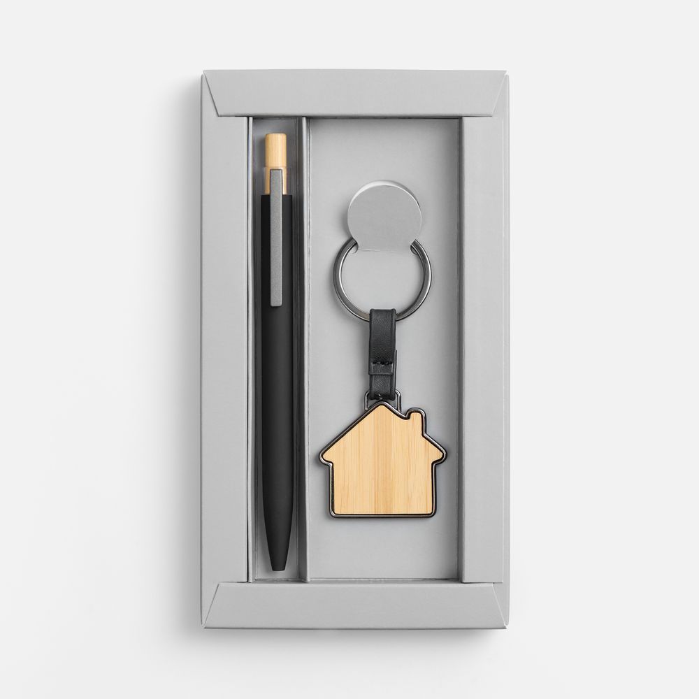| Материал | брелок - металл; бамбук; ручка - металл, алюминий, кнопка - бамбук; коробка - картон |