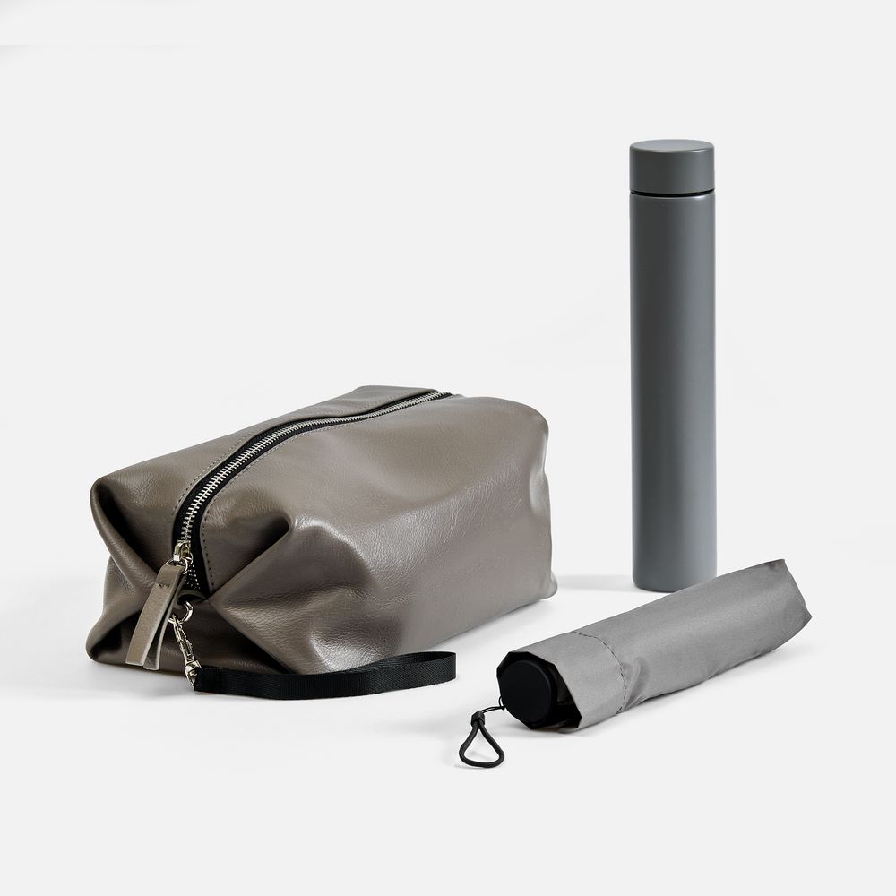 | Материал | несессер - искусственная кожа; зонт - полиэстер, 300Т, спицы - стеклопластик; ручка - прорезиненный пластик; бутылка - нержавеющая сталь, 304 внутри, 201 снаружи; матовое покрытие |