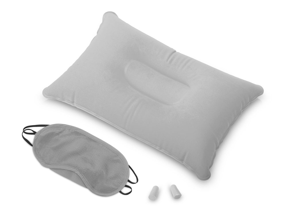 Путешествуйте с комфортом вместе с дорожным набором Cloud, который включает в себя подушку из ПВХ прямоугольной формы, повязку на глаза и полиуретановые беруши. Также в комплекте есть чехол на завязках для хранения и удобной транспортировки.