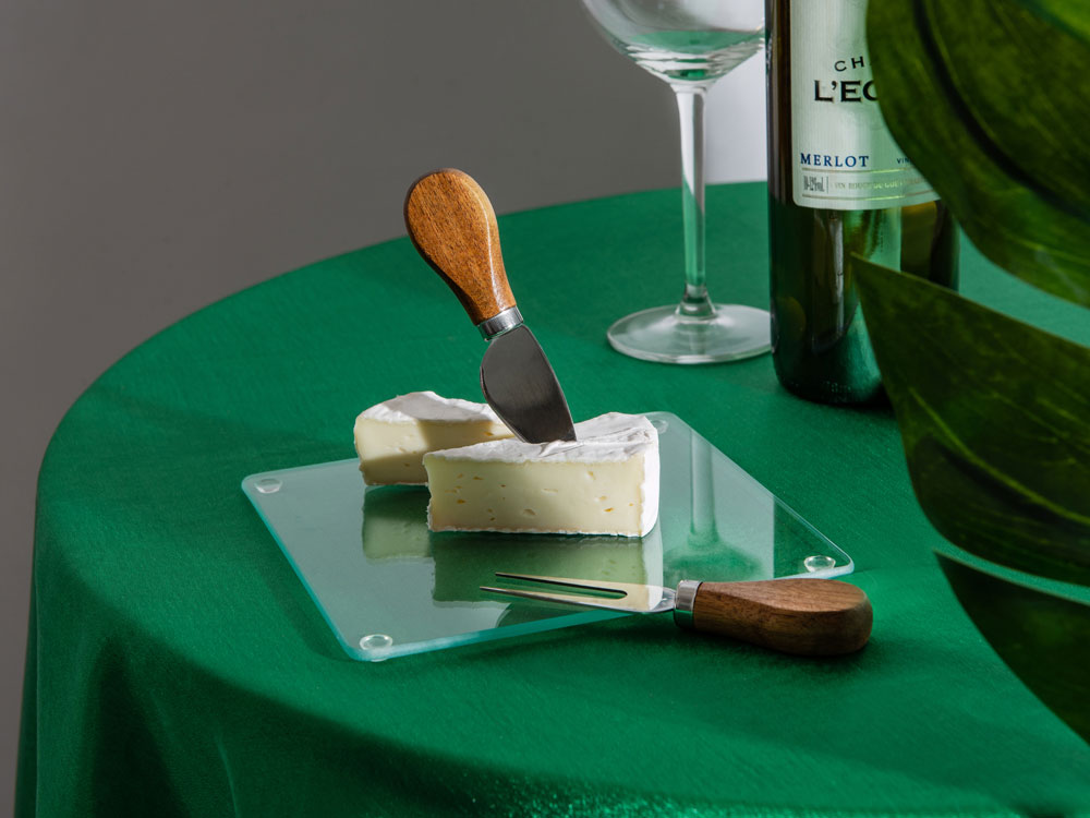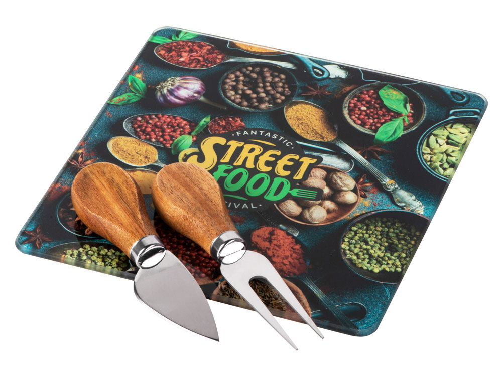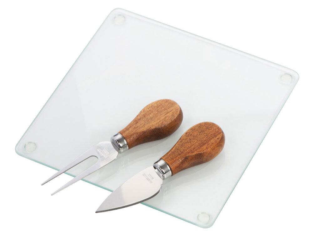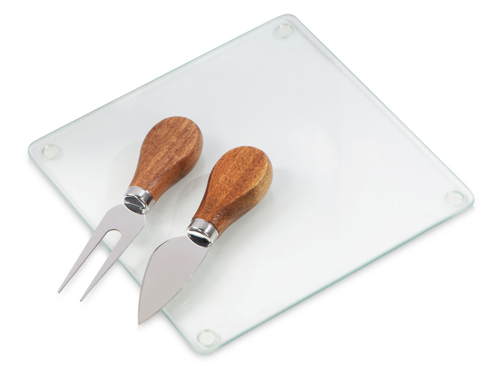 Набор для подачи закусок Dorblue состоит из стеклянной доски, вилки и ножа. Ручки приборов для сыра выполнены из акации — дерева, которое идеально подходит для подобных изделий. Акация благородно выглядит, красиво смотрится с гравировкой и не сильно боится влаги. - возможность полноцветного нанесения на доску (УФ печать наносится со стороны, которая не соприкасается с пищей, изображение наносится в зеркальном виде) - ручки приборов с полем для гравировки - набор прекрасно подходит для подготовки и сервировки закусок, сыра, колбасных нарезок - стеклянную доску легко мыть - доска выполнена из закаленного стекла - на такой можно разделывать продукты и не переживать, что доска треснет - ножки-стопперы идут в комплекте отдельно, не приклеенными на доску (для возможности полноцветного УФ в край доски)