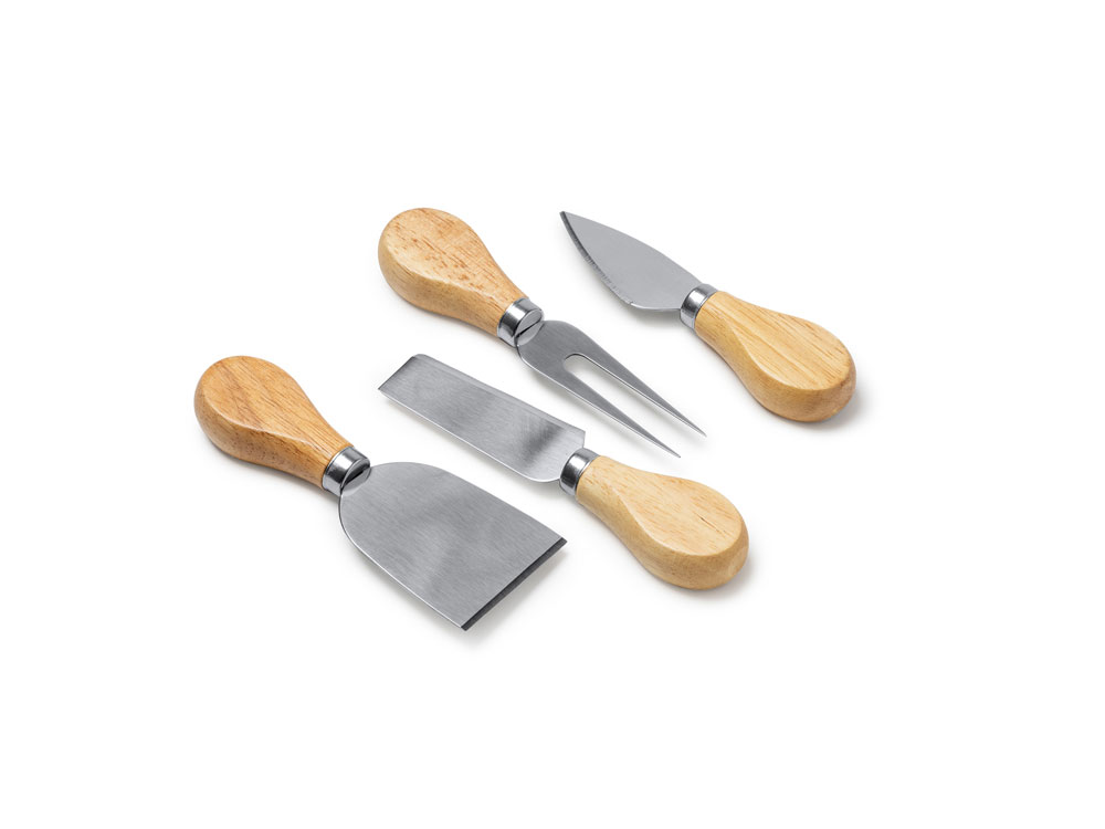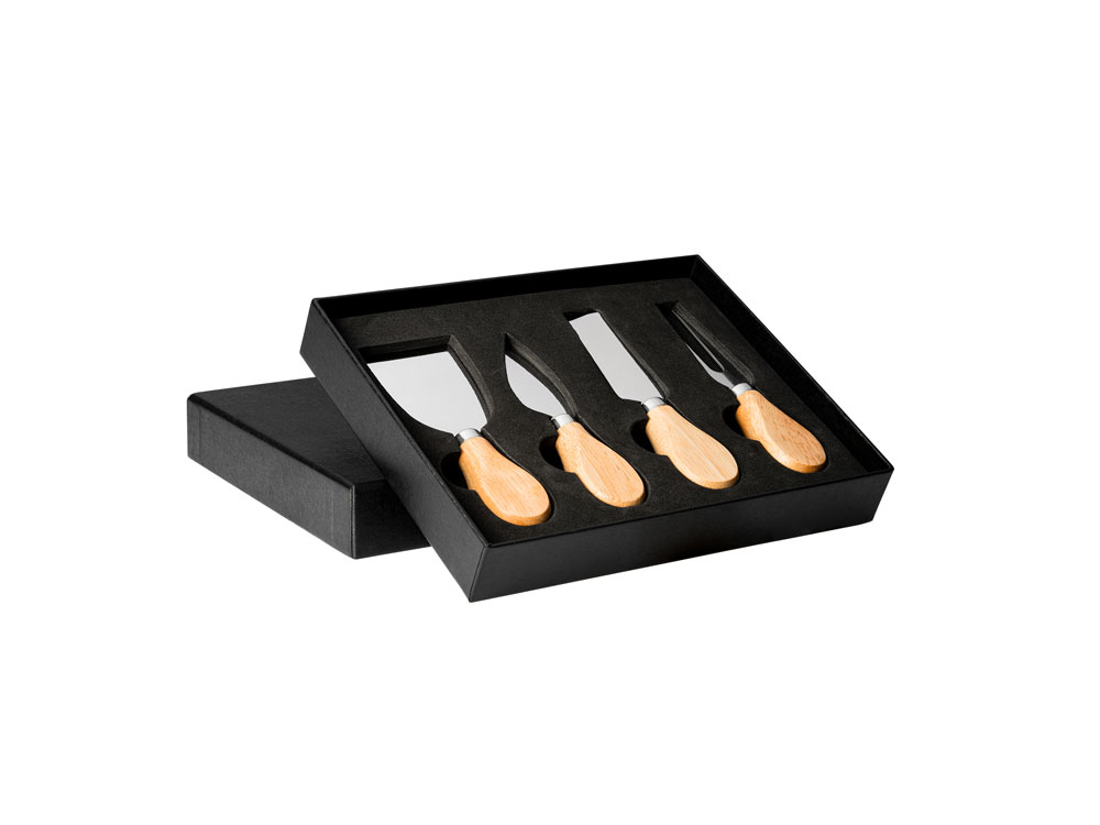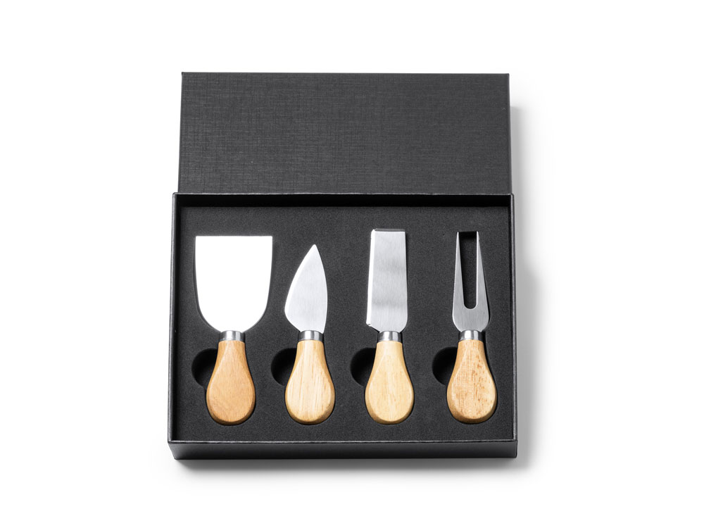Набор для сыра с 4 столовыми приборами из нержавеющей стали и деревянными ручками. Представлен в элегантном футляре