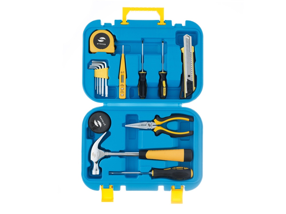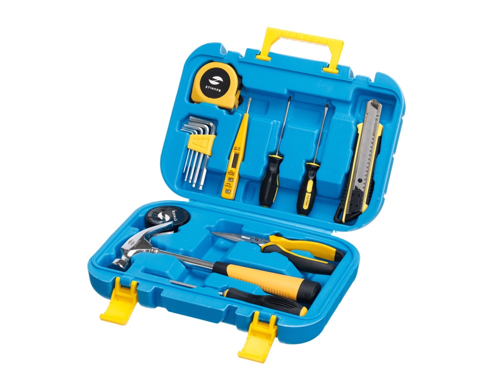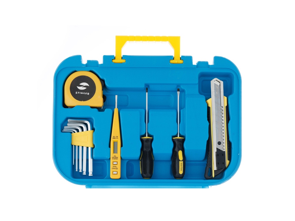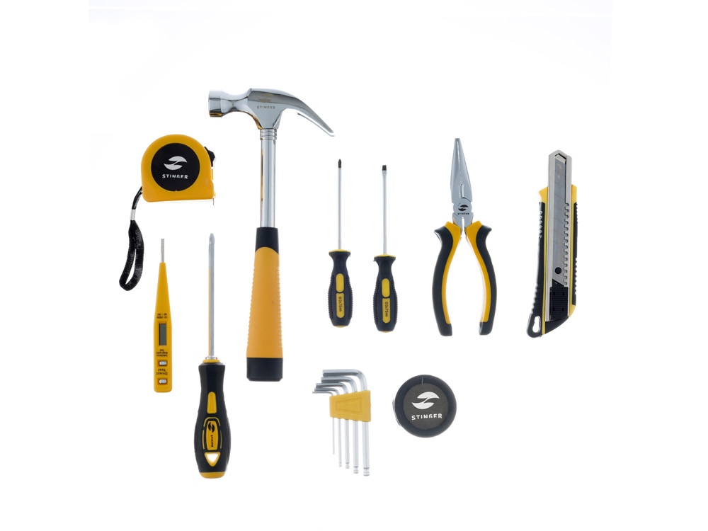 НАБОР ИНСТРУМЕНТОВ STINGER, 15 ПРЕДМЕТОВ Набор инструментов STINGER NST028016 на 15 предметов – идеальный подарок для мужчины. В компактном пластиковом кейсе поместилось всё, что может потребоваться в быту. Все компоненты выполнены из высококачественной закаленной углеродистой стали с хромированным покрытием. Эргономичная пластиковая ручка обеспечивает устойчивое положение в руке. Кейс размером 290 х 75 x 205 мм не занимает много места. Его можно разместить на полке, в шкафу, в машине или гараже. В КОМПЛЕКТЕ: 1. Нож канцелярский - 1 шт. 2. Отвёртка шлицевая - 2 шт. 3. Отвёртка крестовая - 2 шт. 4. Ключ шестигранный – 5 шт. 5. Молоток (0,25 кг) - 1 шт. 6. Отвёртка индикаторная – 1 шт. 7. Рулетка измерительная (1 м) - 1 шт. 8. Лента изоляционная - 1 шт. 9. Плоскогубцы - 1 шт. ХАРАКТЕРИСТИКИ: Материал: углеродистая сталь, пластик, полипропилен Размер: 290 х 205 х 75 мм