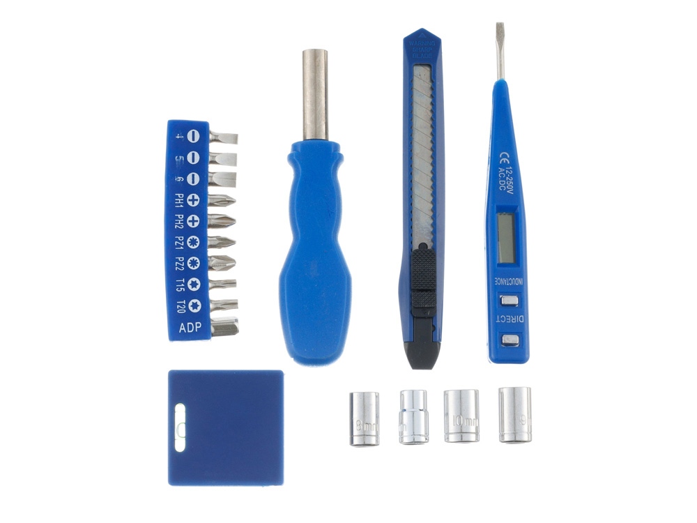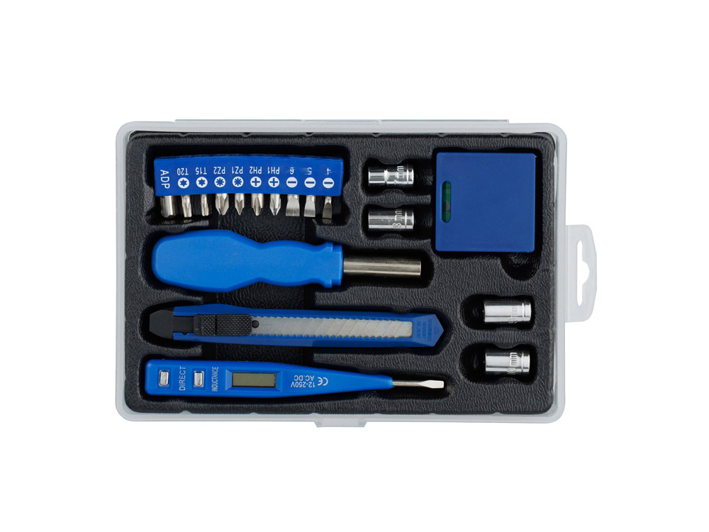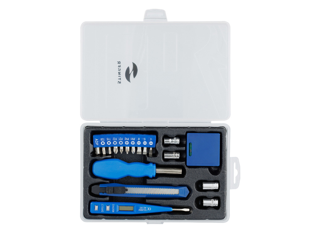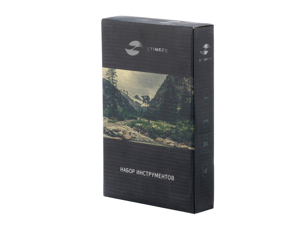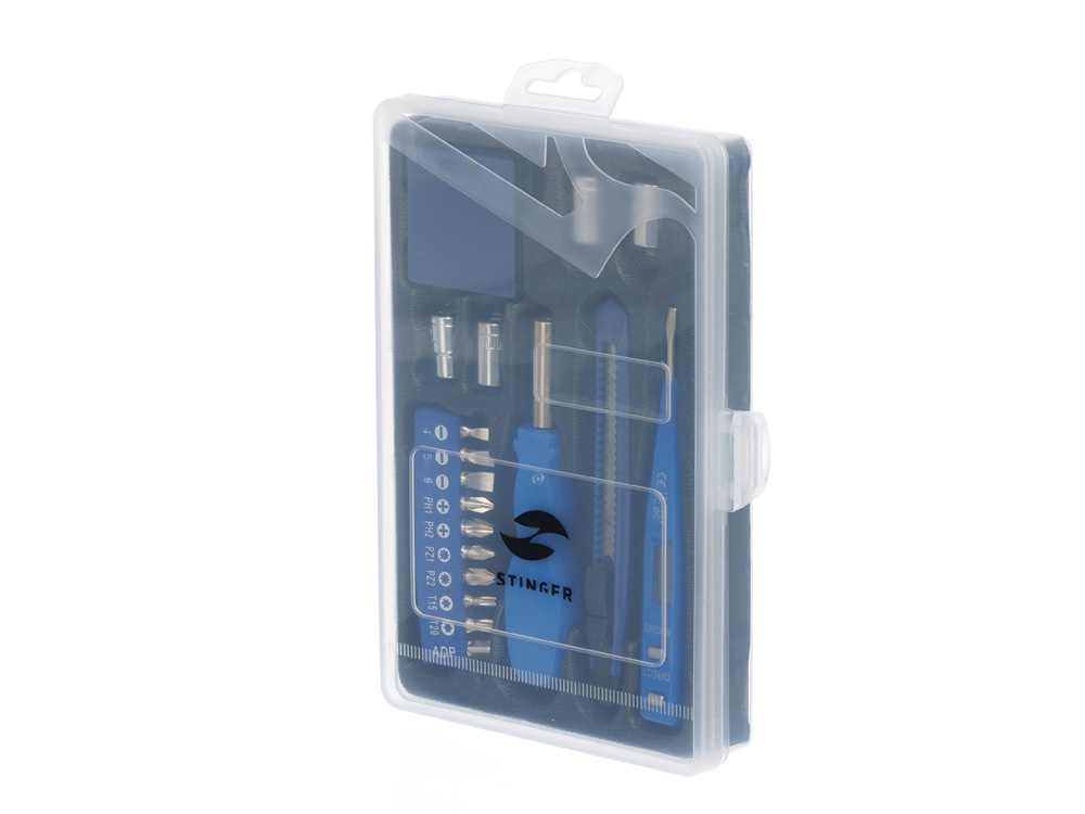 НАБОР ИНСТРУМЕНТОВ STINGER, 18 ПРЕДМЕТОВ Набор инструментов на 18 предметов STINGER W0504 представляет собой оптимальное сочетание функциональности и качества. В компактном белом кейсе найдется всё для проведения мелкого бытового ремонта. Все предметы изготовлены из высококачественной закаленной углеродистой стали с хромированным покрытием, а рукоятки - из углепластика, обеспечивающего удобное положение инструмента в руке. В КОМПЛЕКТЕ: 1. Рукоятка для бит - 1 шт. 2. Бита - 9 шт. 3. Адаптер для шестигранных головок – 1 шт. 4. Головка шестигранная – 4 шт. (7/8/9/10 мм) 5. Рулетка измерительная (1 м) с уровнем – 1 шт. 6. Нож канцелярский - 1 шт. 7. Отвёртка индикаторная – 1 шт. ХАРАКТЕРИСТИКИ: Материал: углеродистая сталь, углепластик (карбон) Размер: 215 х 130 х 30 мм