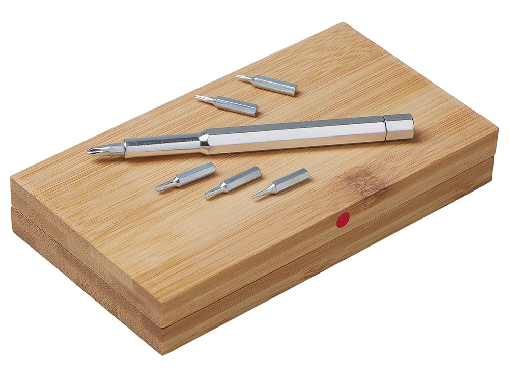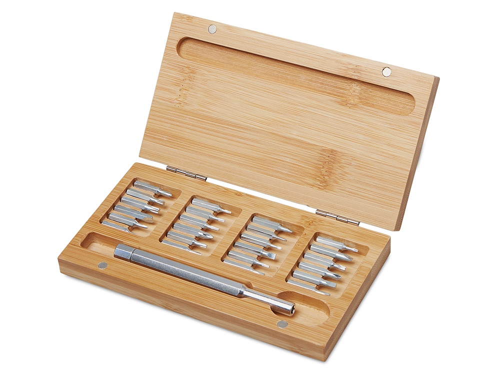 Стильный и практичный набор отверток в элегантном корпусе из натурального бамбука. Компактный кейс закрывается на магниты, а верхняя крышка отмечена круглым красным стикером для удобной идентификации. Внутри — отвертка и 24 наиболее востребованные биты: крестовые, плоские и звездочки, которые подойдут для решения большинства бытовых и профессиональных задач. Набор выполнен из экологичных материалов — прочной стали и натурального бамбука. Классическая прямоугольная форма без выступающих деталей делает его особенно удобным для персонализации и нанесения логотипа. • 24 популярные биты в одном наборе • Экологичные материалы: натуральный бамбук и сталь • Магнитная фиксация крышки • Удобная прямоугольная форма под нанесение логотипа • Компактный и презентабельный дизайн