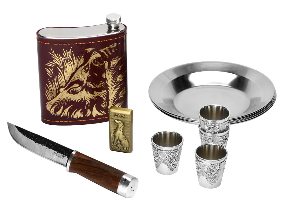 | Комплектность | тарелка d18,3 х 2,5 см - 4шт, нож 23,5 х 3 х 2,3 см, зажигалка 3,3 х 6,7 х 1,2 см, стопка d4,3 х 4,9 см - 4шт, фляга 12,7 х 16 х 4 см |