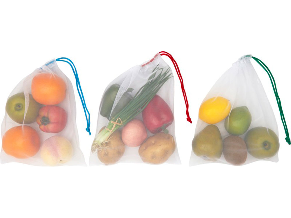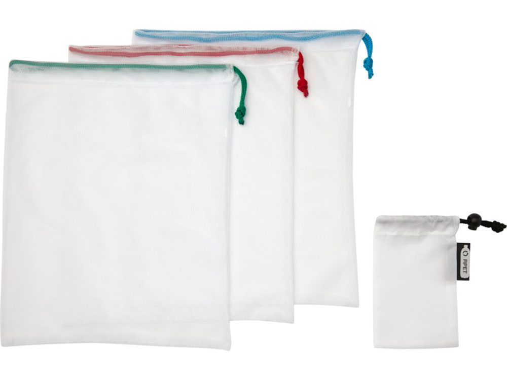 Набор из 3 сетчатых сумок из вторичного ПЭТ. Сумки многоразового использования, их можно использовать для фруктов и овощей как альтернативу пластиковым пакетам. У всех сумок есть затягивающий шнурок. Переработанный PET пластик.