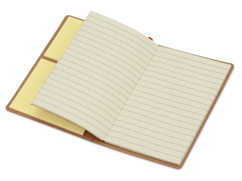 Компактный набор включает в себя разноцветные стикеры разных размеров, блокнот с линованной бумагой и ручку c корпусом из переработанного картона. Обложка выполнена из фактурной искусственной кожи, которая, при тиснении, меняет цвет на более глубокий.