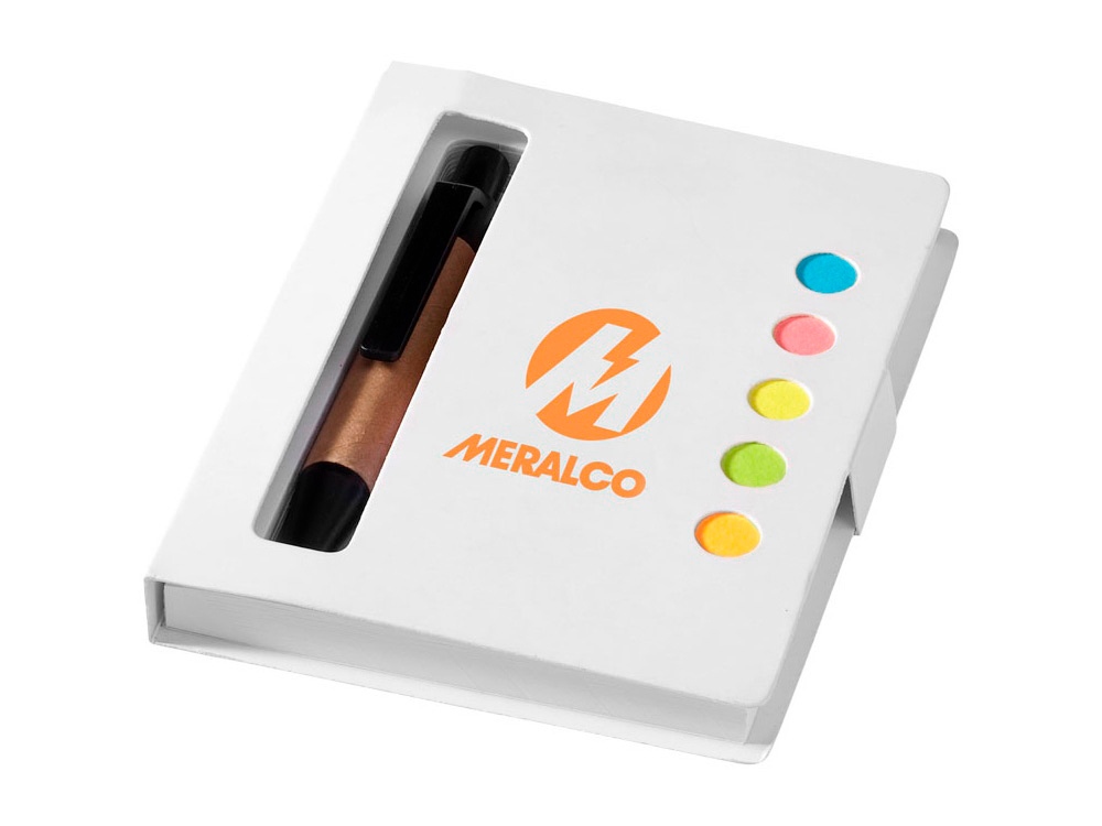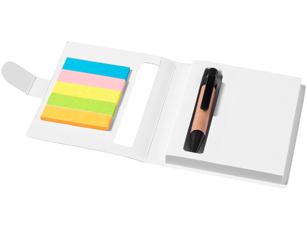 Набор цветных стикеров с шариковой ручкой и блоком из 80 белых отрывных листков. Очень удобный и функциональный аксессуар для офиса, а также отличный промо-сувенир. На обложку из уплотненного картона возможно нанесение логотипа вашей компании.