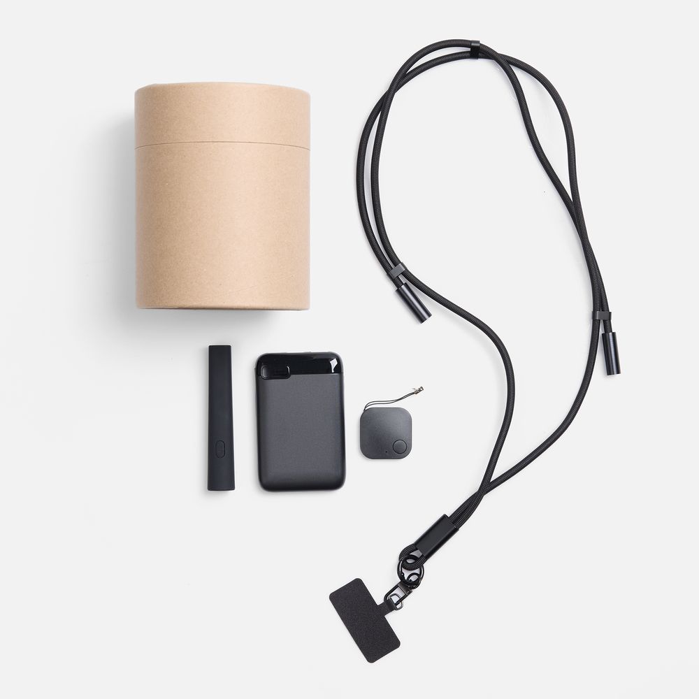 | Материал | аккумулятор, трекер - пластик; оплетка - нейлон, металл; фонарик - АБС-пластик, покрытие софт-тач; тубус - картон |