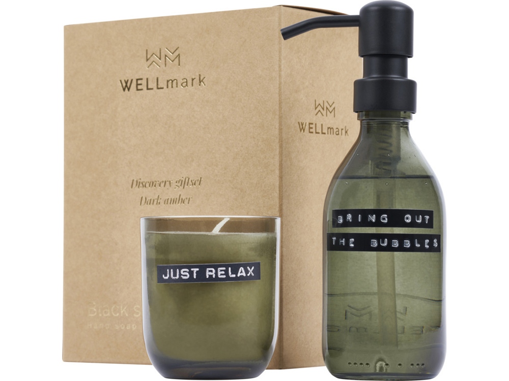 Этот стильный набор дополнит любой интерьер ванной комнаты. Он состоит из дозатора мыла для рук и ароматизированной свечи с приятным ароматом темного янтаря. Мыло для рук поставляется в стеклянной бутылке 250 мл с дозатором и является биоразлагаемым - не содержит парабенов, полиэтиленгликоля пальмового масла, SLS и лауретсульфат натрия. Ароматическая свеча (150г) изготовлена из рапсового воска, который является отличой альтернативой привычным соевому воску или парафину. После полного расплавления свечи, стеклянную емкость из-под нее можно использовать повторно. Сделано в Нидерландах. Стекло.