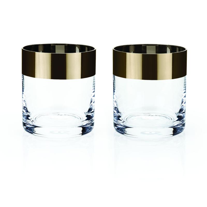 Набор из двух стеклянных стаканов в классическом стиле. Сверху украшены окантовкой бронзового цвета.
