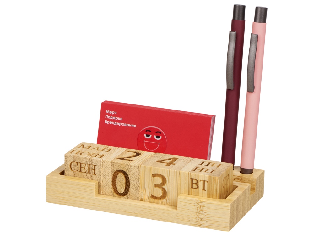 Настольный органайзер с вечным календарем и подставкой для мобильного телефона станет очень удобным помощником для организации пространства на рабочем столе. Кубиками можно выставить нужную вам дату и день недели. Также у органайзера есть подставка для визиток, телефона и 2-х ручек.
