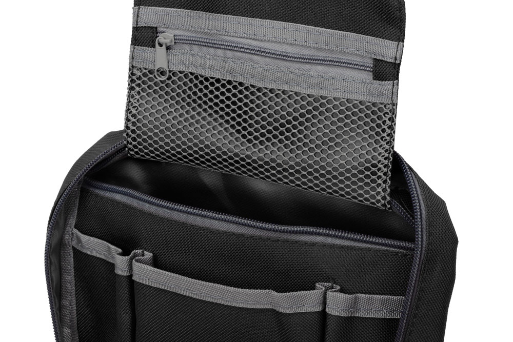 Несессер для путешествий – неотъемлемый атрибут комфортных поездок, служащий для компактного хранения различных мелочей. Аксессуар также пригодится для походов в спортзал и просто поддержания порядка дома. Это превосходный подарок любителю путешествий, а также отличный вариант промо-презента для рекламных кампаний. Большая поверхность позволяет нанести логотип или слоган фирмы. • Вместительное пространство с двумя большими отделениями и несколькими карманами дает возможность эргономично распределить весь дорожный арсенал косметических и туалетных принадлежностей. • Крючок позволяет подвесить аксессуар, например, в уборной поезда или гостиничном номере, в случае отсутствия полки. • Оптимальные размеры, не превышающие формат А4, позволяют легко разместить несессер в любом чемодане или дорожной сумке.