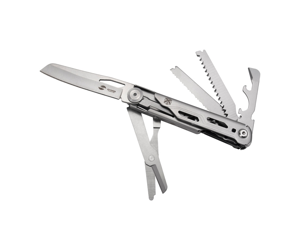Нож перочинный STINGER имеет 9 функций: 1. Лезвие с фиксатором клинка Liner Lock 2. Ножницы 3. Пила 4. Лезвие с серрейторной заточкой 5. Открывалка для бутылок 6. Консервный нож 7. Инструмент для снятия изоляции 8. Стеклобой 9. Клип ХАРАКТЕРИСТИКИ Материалы • лезвие/инструменты: нержавеющая сталь 440A, твердость 54-58 HRC • рукоять: нержавеющая сталь 440A, твердость 54-58 HRC Размеры • Размеры ножа: 112х20х25 мм • Общая длина: 185,5 мм • Длина клинка: 79,3 мм • Наибольшая ширина клинка: 17 мм • Толщина обуха: 2,5 мм • Длина рукояти: 111,3 мм • Ширина рукояти (в ср.части): 19,4 мм • Толщина рукояти (в ср.части): 18,9 мм Вес: 141 г Цвет: серебристый Упаковка: картонная коробка