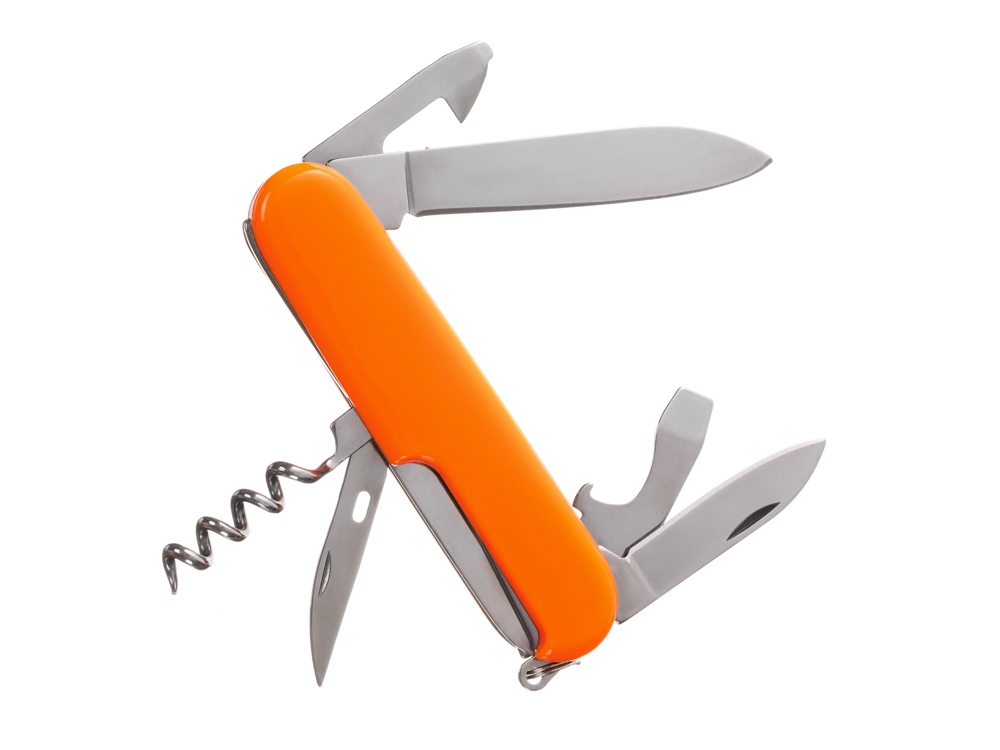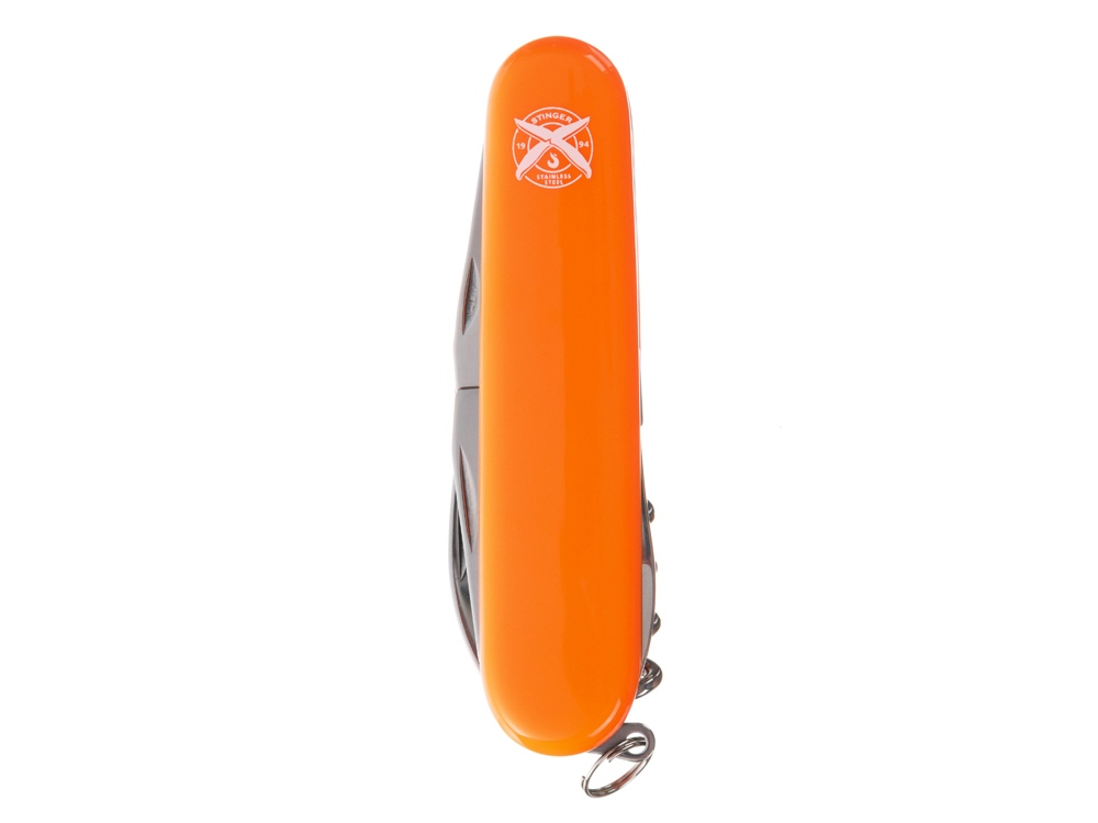 Нож перочинный STINGER имеет 11 функций: 1. Большое лезвие 2. Малое лезвие 3. Консервный нож с: 4. - Малой отверткой 5. Штопор 6. Шило с: 7. - Иглой 8. Открывалка для бутылок с: 9. - Отверткой 10. - Инструментом для снятия изоляции 11. Кольцо для ключей ХАРАКТЕРИСТИКИ Материалы • лезвие/инструменты: нержавеющая сталь 420, твердость 44-48 HRC • рукоять: нержавеющая сталь 420, твердость 44-48 HRC • накладки рукояти: АБС-пластик Размеры • Размеры ножа: 90х26,5х14 мм • Общая длина: 160,4/131,3 мм • Длина клинка: 67,8/40,4 мм • Наибольшая ширина клинка: 12,4/9,4 мм • Толщина обуха: 2,5/1,5 мм • Длина рукояти: 92,6/90,9 мм • Ширина рукояти (в ср.части): 20,6 мм • Толщина рукояти (в ср.части): 15 мм Вес: 80 г Цвет накладок рукояти: оранжевый Накладки рукояти ножа не подлежат замене. Упаковка: картонная коробка