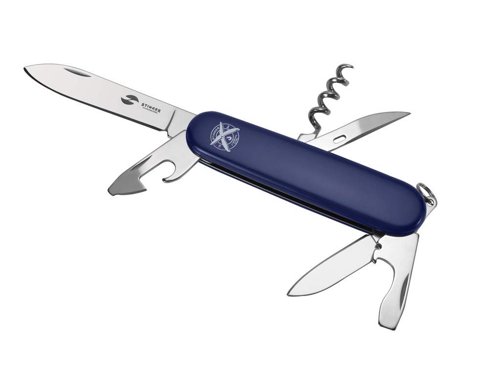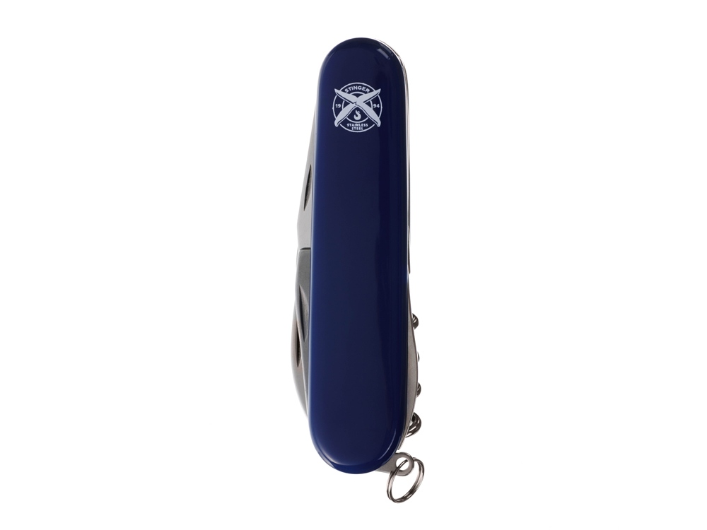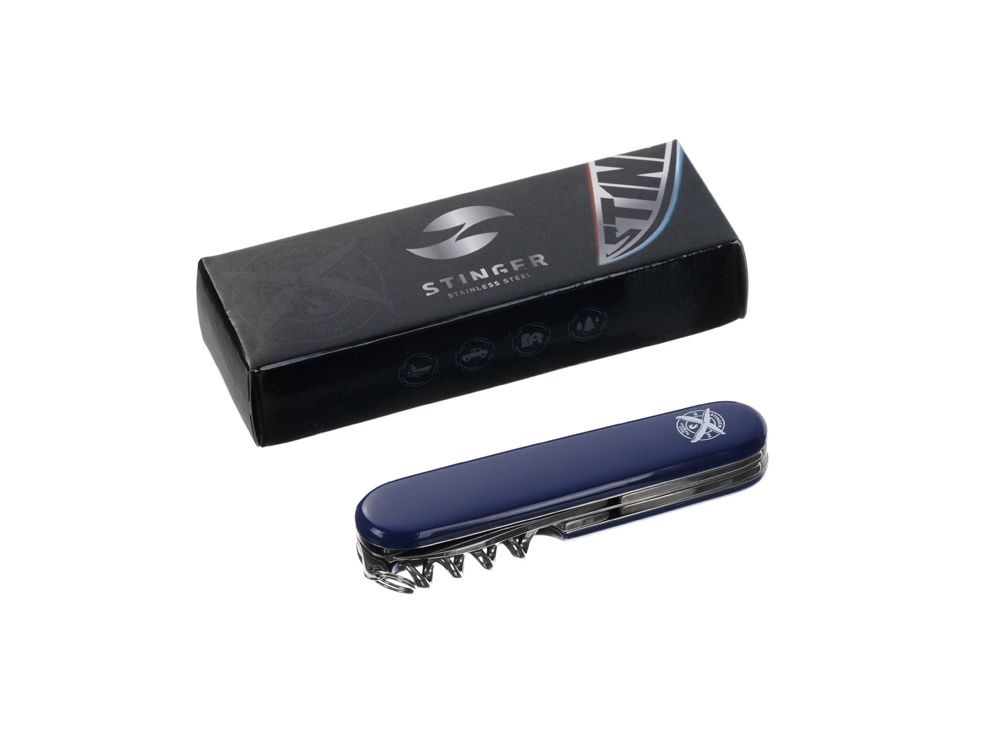 Нож перочинный STINGER имеет 11 функций: 1. Большое лезвие 2. Малое лезвие 3. Консервный нож с: 4. - Малой отверткой 5. Штопор 6. Шило с: 7. - Иглой 8. Открывалка для бутылок с: 9. - Отверткой 10. - Инструментом для снятия изоляции 11. Кольцо для ключей ХАРАКТЕРИСТИКИ Материалы • лезвие/инструменты: нержавеющая сталь 420, твердость 44-48 HRC • рукоять: нержавеющая сталь 420, твердость 44-48 HRC • накладки рукояти: АБС-пластик Размеры • Размеры ножа: 90х26,5х14 мм • Общая длина: 160,4/131,3 мм • Длина клинка: 67,8/40,4 мм • Наибольшая ширина клинка: 12,4/9,4 мм • Толщина обуха: 2,5/1,5 мм • Длина рукояти: 92,6/90,9 мм • Ширина рукояти (в ср.части): 20,6 мм • Толщина рукояти (в ср.части): 15 мм Вес: 80 г Цвет накладок рукояти: синий Накладки рукояти ножа не подлежат замене. Упаковка: картонная коробка