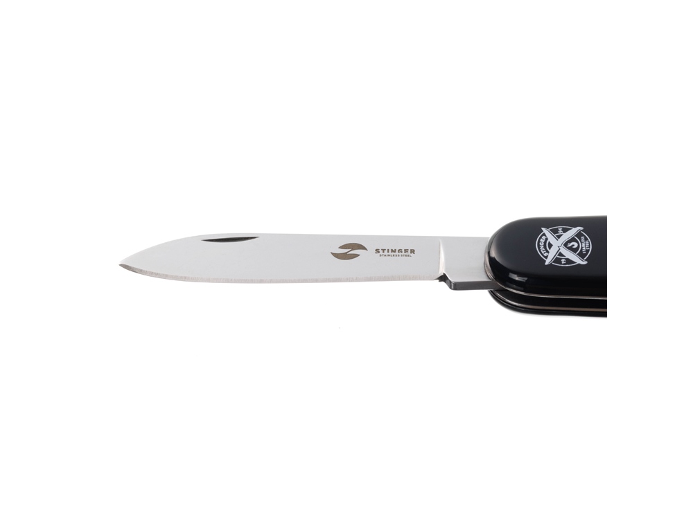 Нож перочинный STINGER имеет 4 функции: 1. Большое лезвие 2. Малое лезвие 3. Штопор 4. Кольцо для ключей ХАРАКТЕРИСТИКИ Материалы • лезвие/инструменты: нержавеющая сталь 420, твердость 44-48 HRC • рукоять: нержавеющая сталь 420, твердость 44-48 HRC • накладки рукояти: АБС-пластик Размеры • Размеры ножа: 90х26,5х14 мм • Общая длина: 160/131, мм • Длина клинка: 67,7/40,2 мм • Наибольшая ширина клинка: 12,3/9,2 мм • Толщина обуха: 2,5/1,5 мм • Длина рукояти: 92,3/90,9 мм • Ширина рукояти (в ср.части): 20,3 мм • Толщина рукояти (в ср.части): 12,2 мм Вес: 55 г Цвет накладок рукояти: черный Накладки рукояти ножа не подлежат замене. Упаковка: картонная коробка