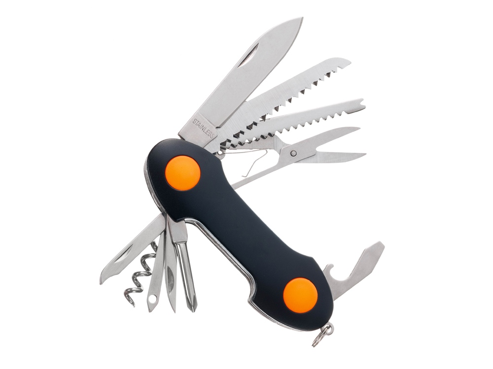 Нож перочинный STINGER имеет 15 функций: 1. Большое лезвие 2. Пила по дереву 3. Инструмент для чистки рыбы с: 4. - Инструментом для извлечения рыболовного крючка 5. Ножницы 6. Консервный нож 7. Открывалка для бутылок с: 8. - Отверткой 9. Крестовая отвертка 10. Ледокол 11. Пилка для ногтей с: 12. - Инструментом по уходу за ногтями 13. Игла 14. Штопор 15. Кольцо для ключей Материалы • лезвие/инструменты: нержавеющая сталь 420, твердость 44-48 HRC • рукоять: нержавеющая сталь 420, твердость 44-48 HRC • накладки рукояти: алюминий, полипропилен Размеры • Размеры ножа: 95х30х20 мм • Общая длина: 156,7 мм • Длина клинка: 60,1 мм • Наибольшая ширина клинка: 11,9 мм • Толщина обуха: 1,7 мм • Длина рукояти: 96,6 мм • Ширина рукояти (в ср.части): 24,7 мм • Толщина рукояти (в ср.части): 21,7 мм Вес: 139 г Цвет накладок рукояти: черный, оранжевый Накладки рукояти ножа не подлежат замене. Упаковка: картонная коробка