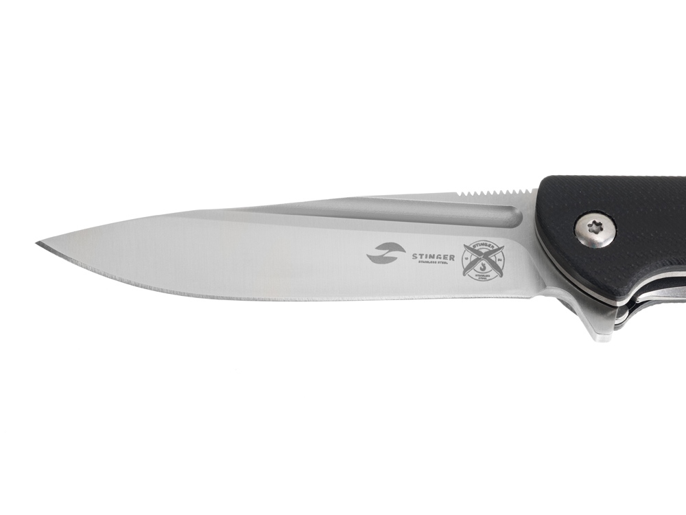 НОЖ СКЛАДНОЙ STINGER Повседневный складной нож из высококачественных материалов, идеально подойдет для решения большинства задач. Рукоять ножа изготовлена из стали с накладками из стеклотекстолита G10 - композитного материала на основе стеклоткани и эпоксидной смолы. G10 является прочным и ударостойким материалом, отлично переносит влагу, отличается повышенной стойкостью к огню. Рукоять ножа собрана на втулках - бонках, поэтому при необходимости его можно легко промыть. На рукояти расположено отверстие для темляка и клипса для удобного размещения ножа в кармане. Нож открывается при помощи флиппера с ассистом (механизм ускоренного открывания), который может дополнительно выполнять роль гарды, предотвращая соскальзывание руки на лезвие клинка. На верхней части лезвия расположен подпальцевый упор с насечкой для более комфортной работы. Клинок ножа произведен из высокоуглеродистой стали D2, которая пользуется большой популярностью в ножевой индустрии из-за исключительных технических и эксплуатационных параметров. Высокое содержание хрома (11%) и углерода (1,5%) в составе повышают коррозионную стойкость и ударную вязкость сплава, делают его достаточно твердым. D2 имеет твердость по шкале Роквелла в диапазоне 59-61 HRC, что делает ее одной из самых твердых сталей для ножей и позволяет лезвию держать остроту длительный период времени даже при интенсивном использовании. D2 отличается высокой прочностью, устойчивостью к износу и разрушению, что позволяет клинку выдерживать удары и нагрузки. Благодаря высокой твердости и прочности клинок из стали D2 имеет долгий срок службы, обеспечивает качественный и точный срез и не требует частой заточки. Характеристики: Материал клинка: высокоуглеродистая сталь D2 Твердость по шкале Роквелла: 59-61 HRC Материал рукояти: нержавеющая сталь/стеклотекстолит G10 Метод открывания клинка: флиппер с ассистом (механизм ускоренного открывания) Фиксатор клинка: Liner Lock Длина ножа: 187 мм Длина клинка: 81 мм Толщина клинка: 4 мм Вес: 100 г Цвет рукояти: черный Особенности: рукоять с клипом и отверстием под темляк В комплекте: нейлоновый чехол