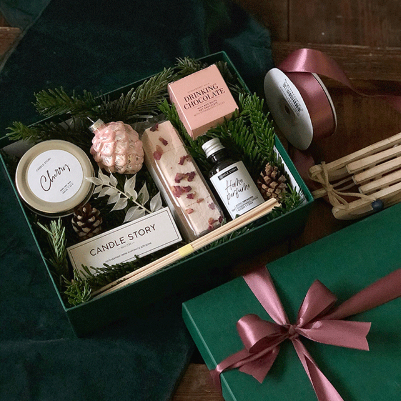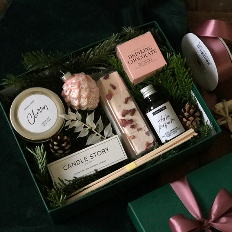 | Состав | Горячий шоколад Tafelgut, соевая свеча ручной работы с поющим фитилем, длинные спички для свечи, интерьерные духи, ротанговые палочки, пастила с лепестками, игрушка на елку (стекло), живая ель, новогодний декор |
