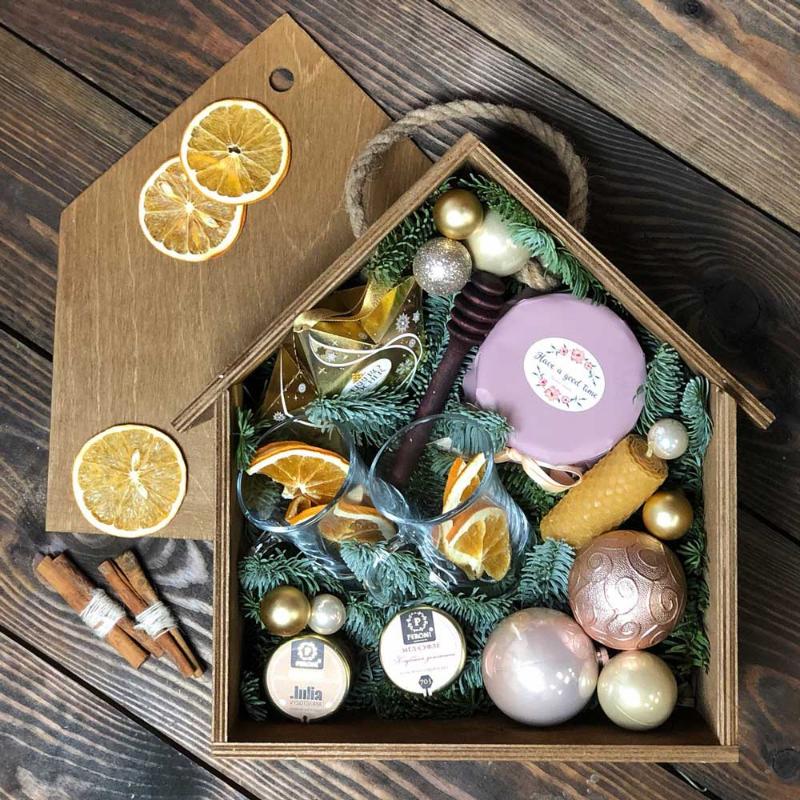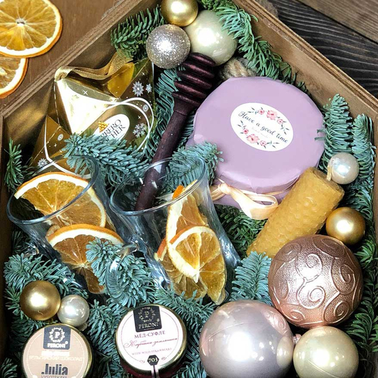 | Состав | банка с урбечем, стаканы для напитков, конфеты Ferrero, свеча из вощины, деревянная ложка для меда, мед-суфле Peroni (2шт.), апельсины, корица, шарики, нобилис |