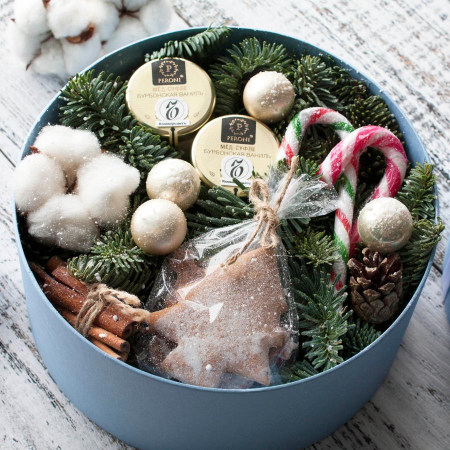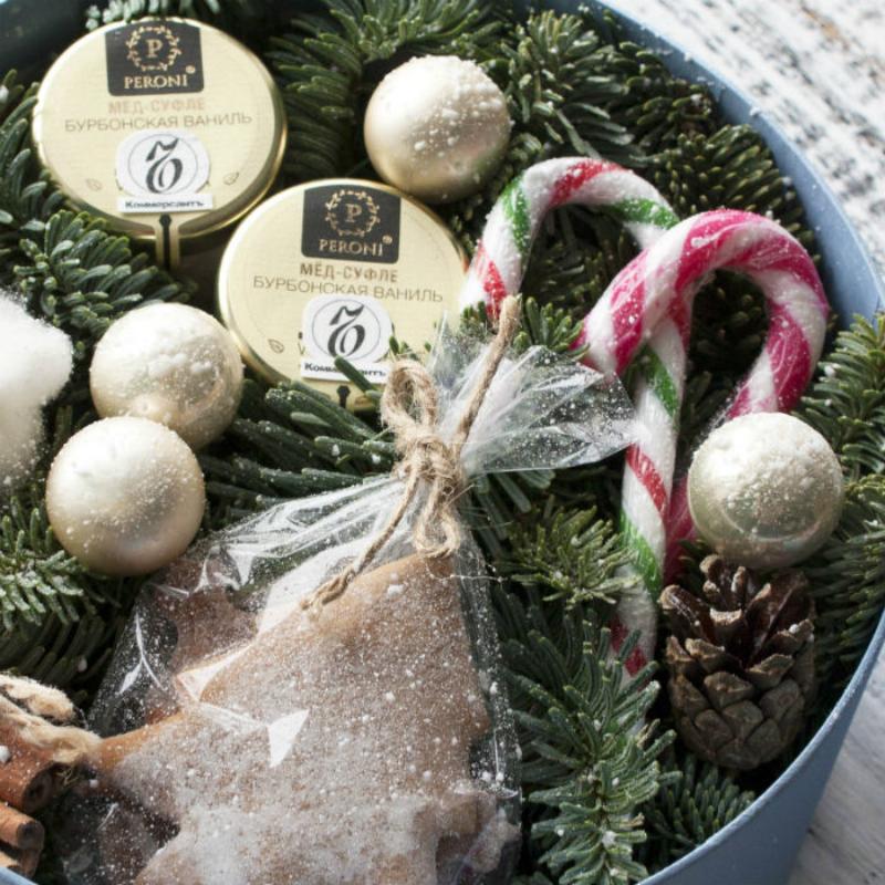 | Состав | мед-суфле 2 шт., имбирные пряники, шишки, палочки корицы, шарики, хлопок, леденцы. |