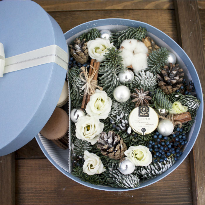 | Состав | макаруны 9 шт, мед-суфле, вибурнум, эустома, бувардия, шишки, палочки корицы, шарики, флористическая губка с влагой для еловых веток. |