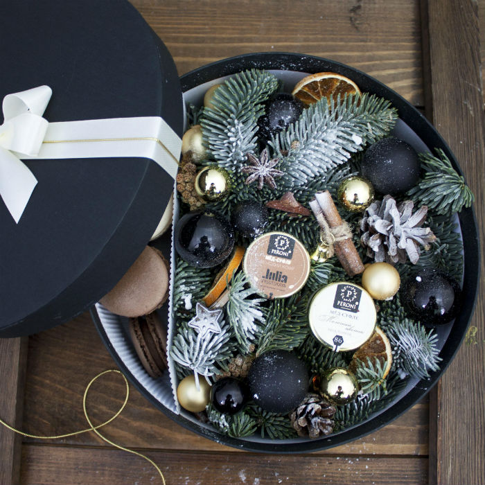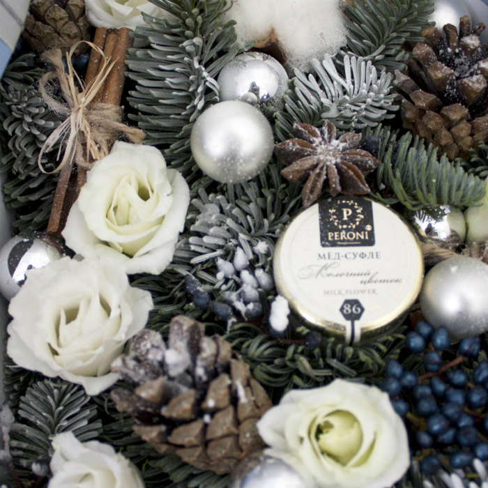 | Состав | макаруны 9 шт, мед-суфле 2 шт, шишки, палочки корицы, сушеные апельсины, шарики, еловые ветки. |