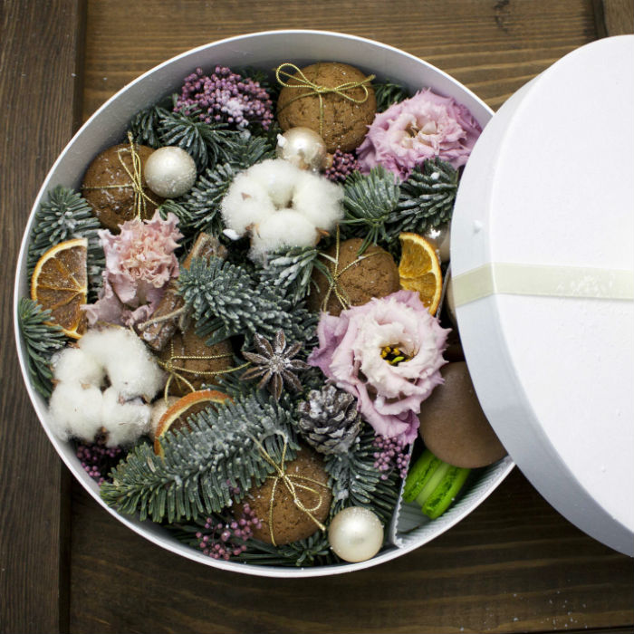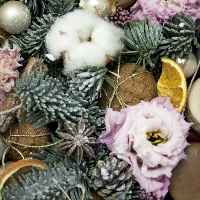 | Состав | макаруны 9 шт, эустома, печенье, сушеные апельсины, хлопок, шарики, флористическая губка с влагой для еловых веток. |