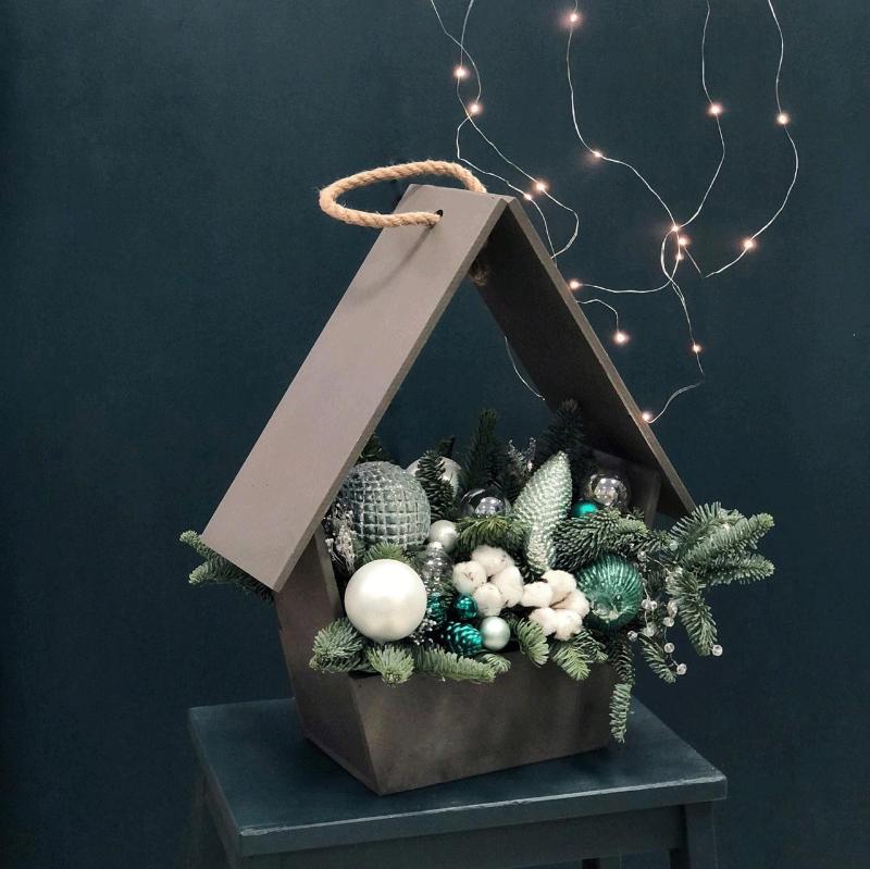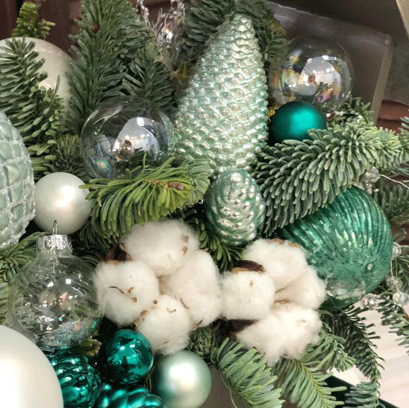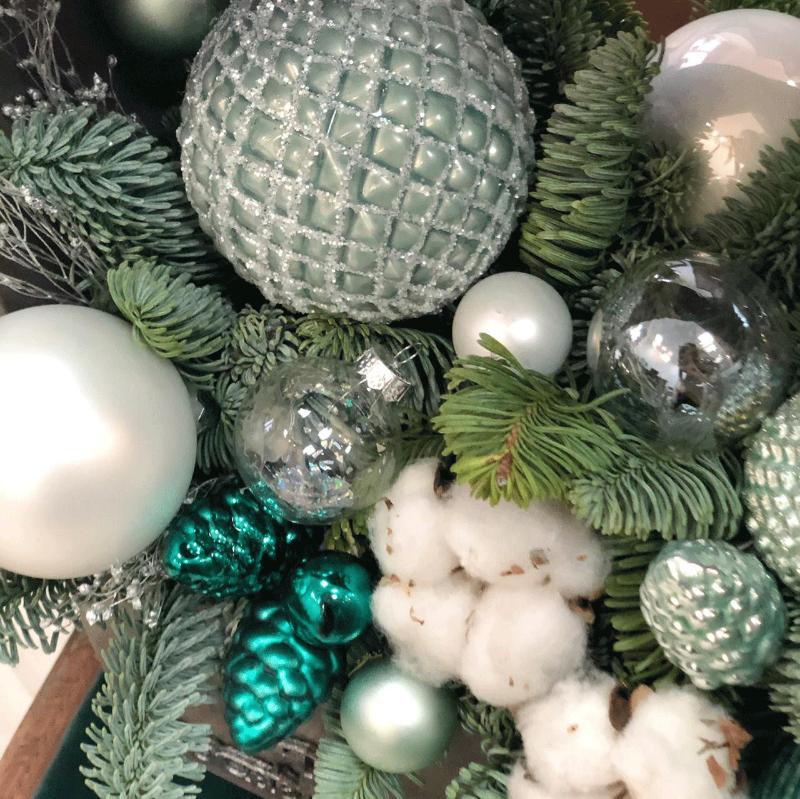 | Состав | веточки нобилиса, елочные игрушки, хлопок, бруния, декор |
