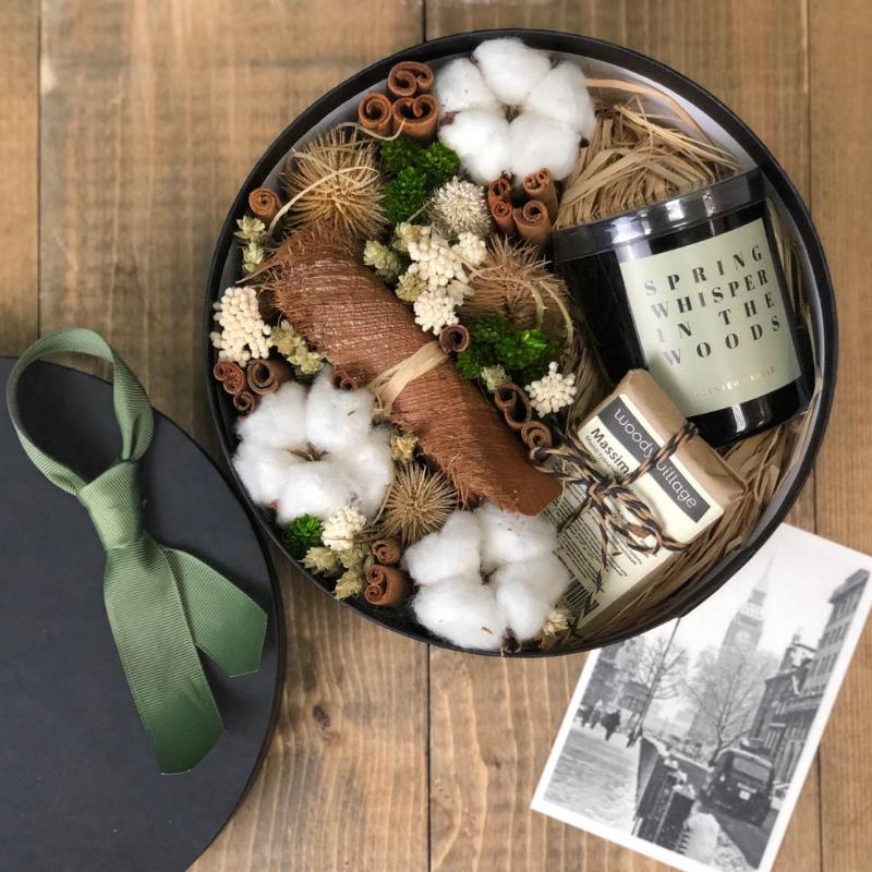 | Состав | свеча интерьерная в стеклянном стакане, мыло ручной работы с ароматом Massima, композиция из сухоцветов |