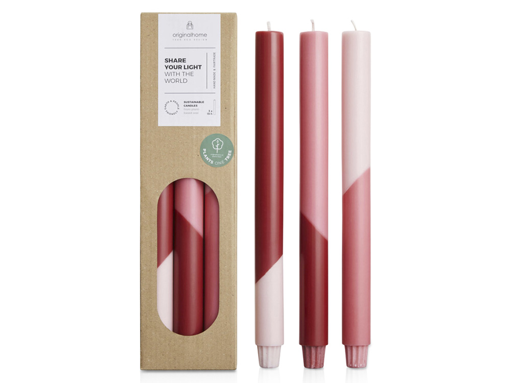 Свечи для ужина Eden отличаются яркой диагональной цветовой палитрой и изготовлены вручную из воска на растительной основе, не содержащего парафина. Они не имеют запаха, имеют фитиль из 100% хлопка и горят чисто. Каждая покупка способствует посадке дерева для фермеров в Африке и поддерживает специальный проект справедливой торговли на острове Ява, Индонезия. Комплект из трех штук. Время горения свечи: 18 – 20 часов. Воск из пальмовых ядер.