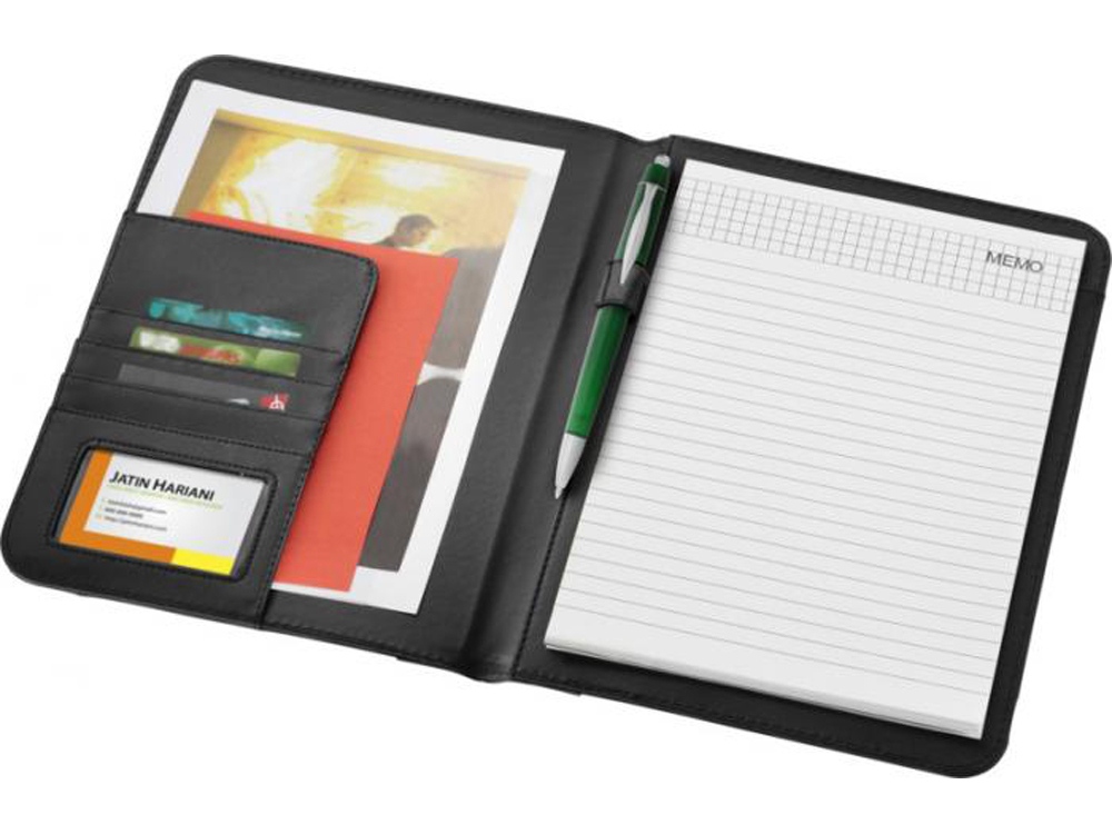 Папка с держателем для ручки, карманами для документов и блокнотом А4 с 20 страницами линованной бумаги. Ручка и принадлежности не включены.