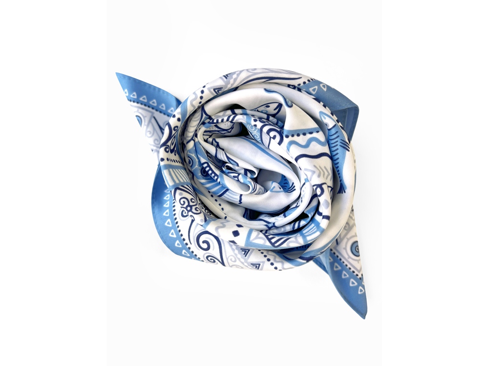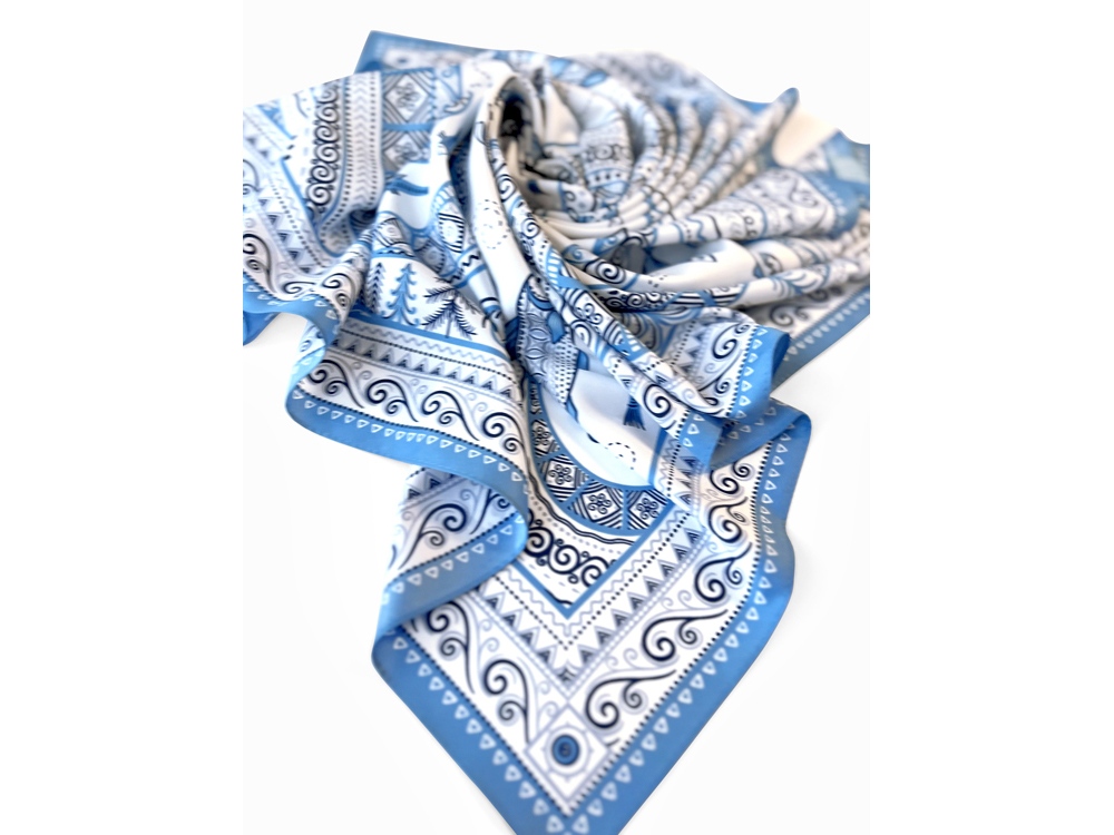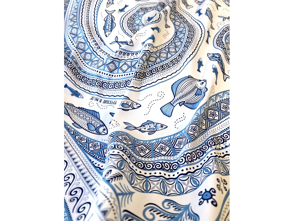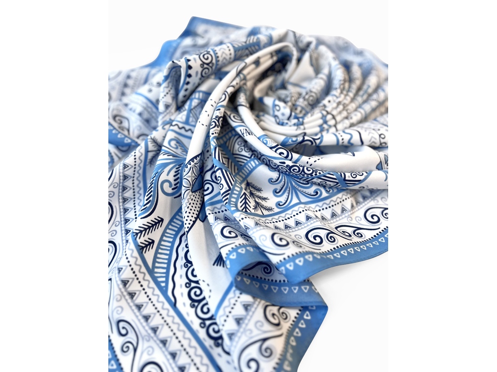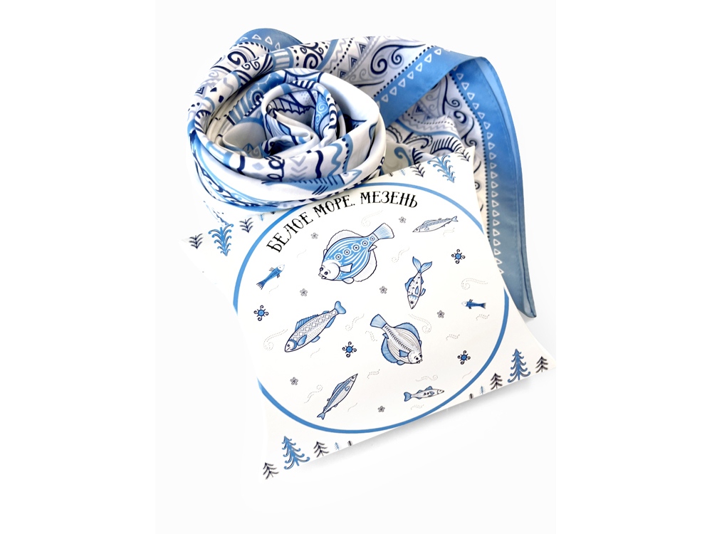 В Архангельской области и на территории Коми протекает река Мезень, впадающая в воды Белого моря. Она щедро кормила северные народы рыбой, и была источником вдохновения талантливых мастеров Мезенской росписи. Эта роспись считается зашифрованным посланием, где каждый символ имеет свое значение. Платок из коллекции бренда Русские в моде посвящён уникальному искусству этой росписи. Изображения спиралевидных орнаментов в виде волн, елочек, рыбок украшают дизайн. Все это означает плодородие стихий земли и воды, энергию солнца, богатство и процветание. Сегодня мезенская роспись - это современный мотив модного аксессуара от Нины Ручкиной. Изящное шёлковое полотно платка, как воды реки-кормилицы, окутает ваш образ нежностью и элегантностью, многократно усилит его красоту и очарование. Пусть наша новинка станет вашим оберегом, символом удачи и преумножения благ! Дизайн платка: Ирина Сказка