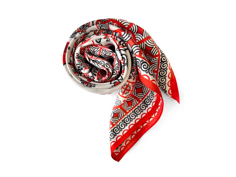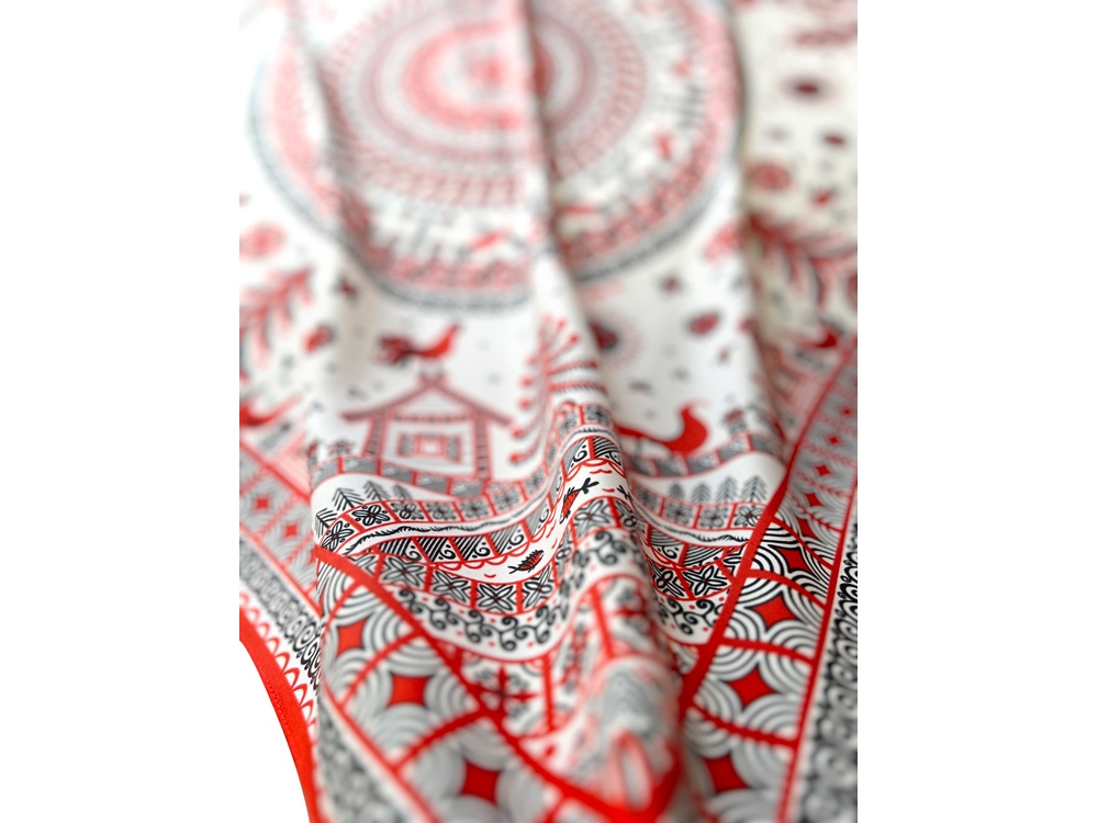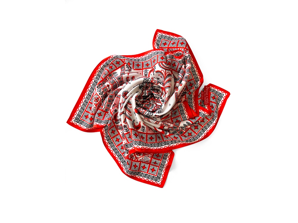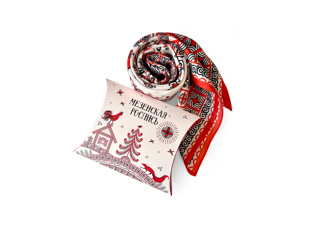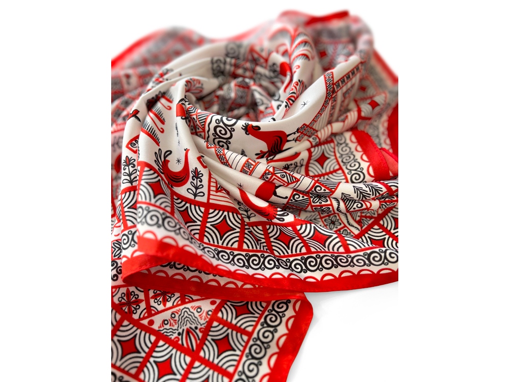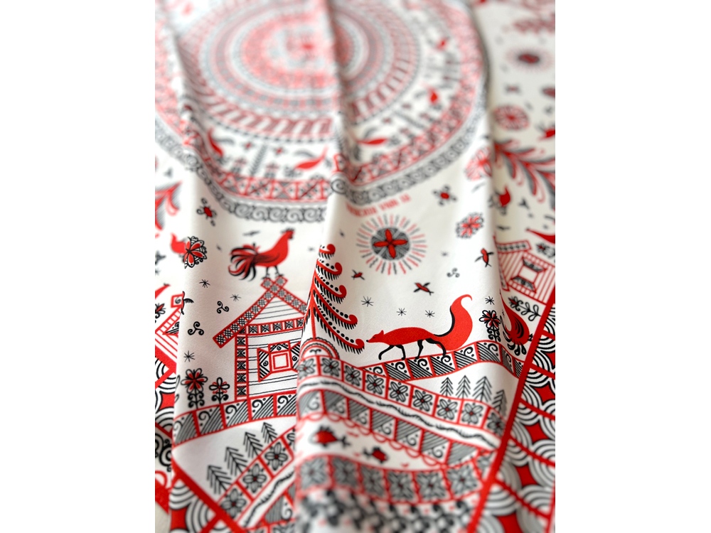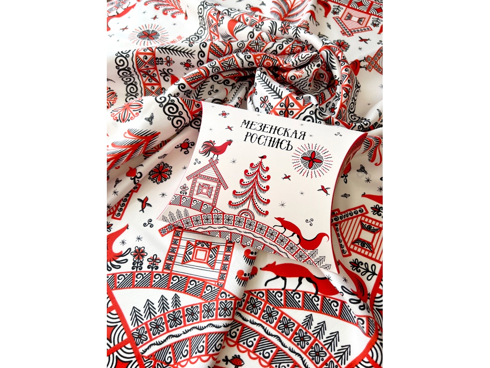 Самобытный орнамент знаменитой мезенской росписи, отличающейся зашифрованным символизмом, лег в основу элегантного платка Мезенская роспись. Петух и лиса. Каждый элемент принта имеет особое значение, и располагается в строго определенном месте, создавая целый рассказ. Ранее такими рисунками украшали избы, посуду и кухонную утварь, передавая послание поколениям. Два народных персонажа, воспетых в старых добрых сказках, хранят в себе мудрость, стремление к свободе и почитание традиций предков. Их часто задействовали в мезенском народном промысле. Лиса — это символ огня и независимости, а петух — солнца и защиты. И ведь это те качества, которыми от природы наделена каждая представительница прекрасного пола. Шелковый аксессуар с красно-черной древней росписью и откликами русской истории гармонично дополнит собой элегантный наряд, станет роскошным оберегом для Вас! Он эффектно завершит образ, расставит недостающие акценты и подчеркнет Вашу уникальную красоту! Автор платка: Ирина Сказка