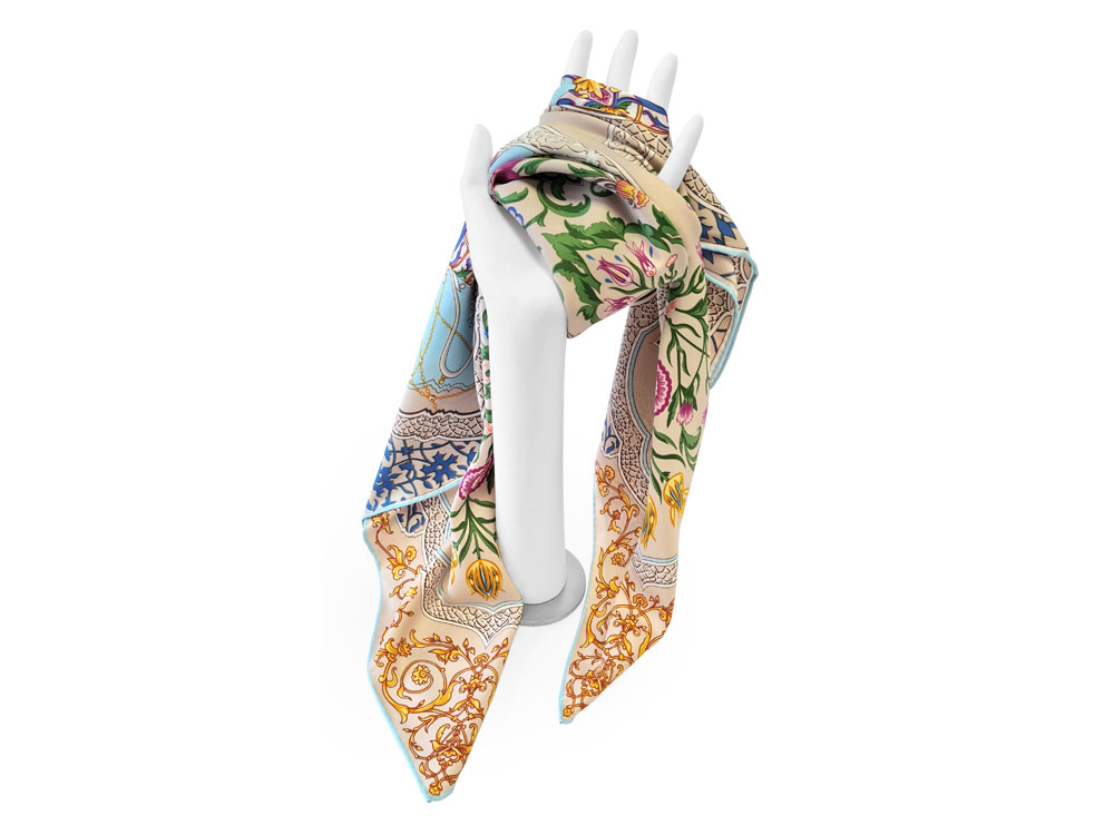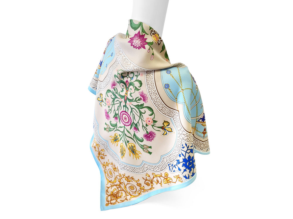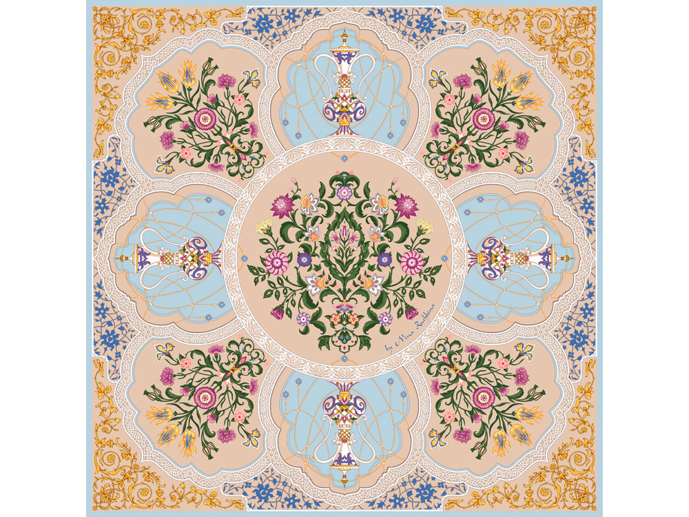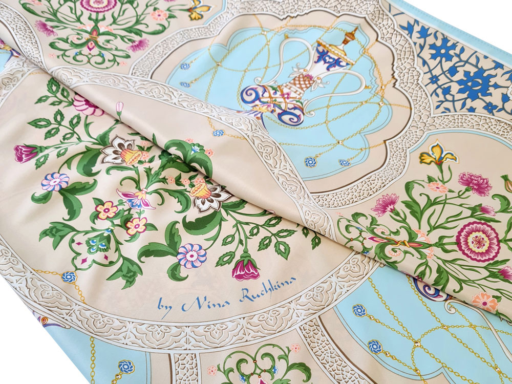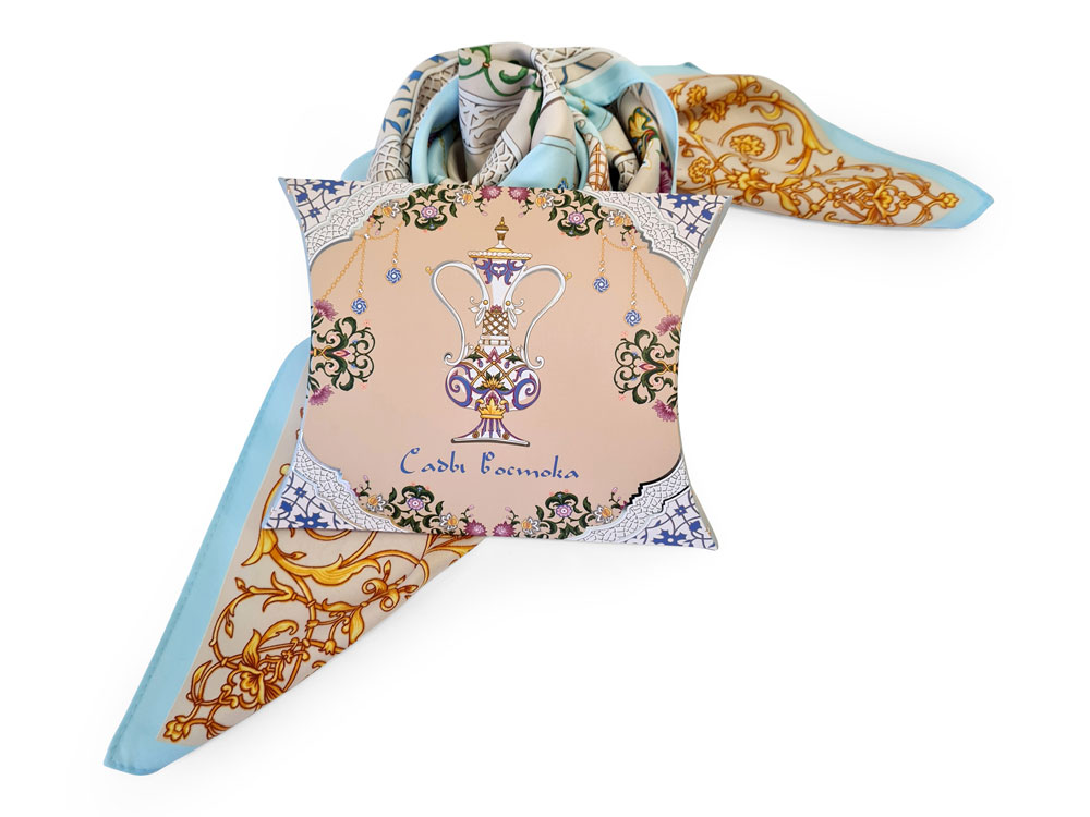 Платок Сады Востока от бренда Русские в моде” by Nina Ruchkina посвящен экзотической красоте, женской привлекательности и очарованию. В центре полотна расположились цветы дивного сада, олицетворяющие собой процветание, мир и земную любовь. Рядом изображены кувшины, наполненные росой молодости и секретами вечно цветущих восточных красавиц. Принт аксессуара образуют знаменитые орнаменты востока — гирих (бесконечный узел”) и ислими (путь в божественный сад”). Непрерывные витиеватые линии в сочетании с узорами из гибких стеблей с зеленой листвой и пестрыми соцветиями завораживают, погружают в состояние медитации, постижения тайны мироздания через призму счастья и красоты. Облачившись в нежный шелковый платок с цветочным принтом от Нины Ручкиной, любая женщина может привнести в свой образ магию Востока, пленить и искусно укрощать мужские сердца. Дизайн: Нина Ручкина, Анна Шулик, Лола и Диана Закировы.
