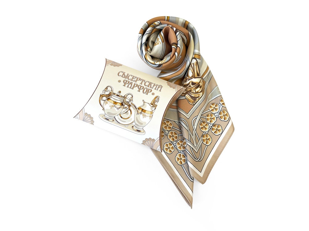 Платок Сысертский фарфор от дизайнера Нины Ручкиной посвящается уральскому народному промыслу, известному с 19 века. Композиция платка словно сказочный лабиринт увлекает за собой, вызывая желания рассматривать детали утонченного сервиза работы уральских мастеров. Изящные фарфоровые предметы расположены в ажурном серванте эпохи модерна. Сочетания благородного золота и слоновой кости, плавные линии и стилизованные цветы рождают необычайно элегантный дизайн авторского аксессуара. Такой платок привнесет дополнительный шик как в базовый гардероб, так и в вечерний стиль. Отголоски многоликого русского модерна, декоративность и символизм, история России и современный дизайн превращают этот платок в великолепный подарок со смыслом. Над дизайном работали: Нина Ручкина, Наталия Александрова.