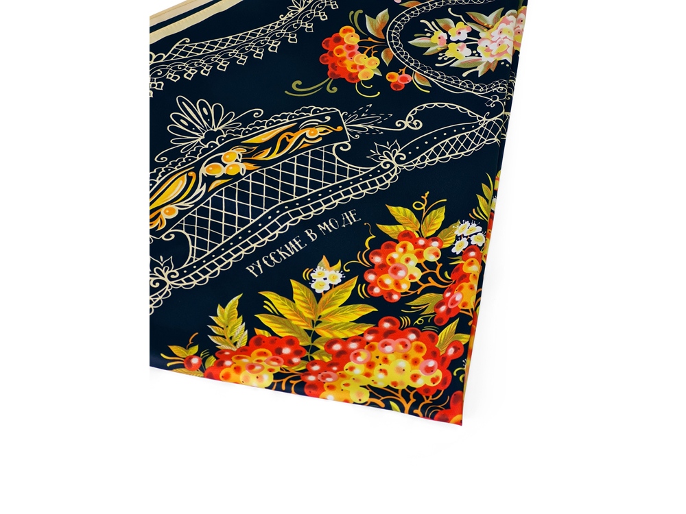 Нижний Тагил - крупнейший промышленный центр Урала, является родиной русского расписного железного подноса. Искусство уральской лаковой росписи, зародившееся в 40-е годы XVIII столетия и активно развивающееся в XXI, обогатило художественную культуру России. В нем воплотился сплав высокого профессионального мастерства, кропотливого труда художников по металлу, стремление к прекрасному и талант народных живописцев. Русская рябина - излюбленный сюжет мастеров тагильского подноса. Она абсолютно уникальна и узнаваема. Эскиз платка дополнят утонченная вязь орнаментов и ажурные решетки, присущие исключительно этому промыслу. Платок Тагильский поднос станет ярким акцентом в вашем гардеробе. Насыщенная терракотово-чёрная цветовая гамма плодов всегда актуальна, а нежные оттенки цветов рябины внесут настроение романтичности и легкости.