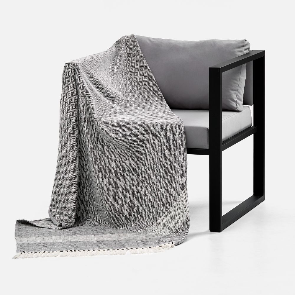 Приглушенные оттенки и динамичный геометрический рисунок на пледе Ladakh настраивают на созерцание, а его уютная мягкость — на приятный отдых в уюте и тепле.