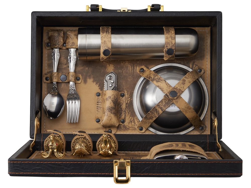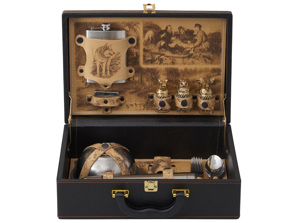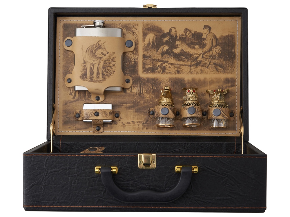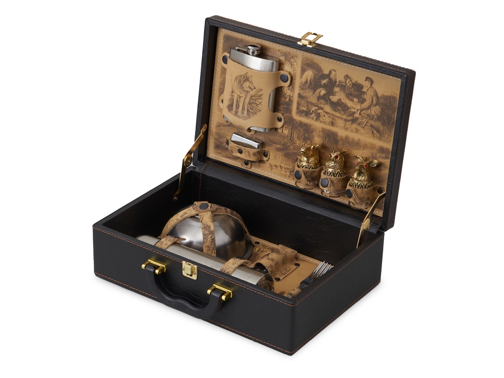 Кейс из сплит-кожи, с повышенной износостойкостью, внутренняя отделка натуральная кожа с художественным выжиганием. Каждое изделие уникально, так как художественное выжигание может отличаться от представленного на фото, что придаёт набору особую индивидуальность. Все аксессуары надежно крепятся к кейсу кожаными ремешками на кнопке, обеспечивая удобство транспортировки и сохранность содержимого. В комплекте: - Фляга 250 мл (нерж.сталь)- 1 шт. - Стопка 40 мл - 3 шт. - Зажигалка зиппо- 1 шт. - Нож складной- 1 шт. - Тарелка из нейзильбера- 3 шт. - Ложка- 3 шт. - Вилка- 3 шт. - Термос- 1 шт.