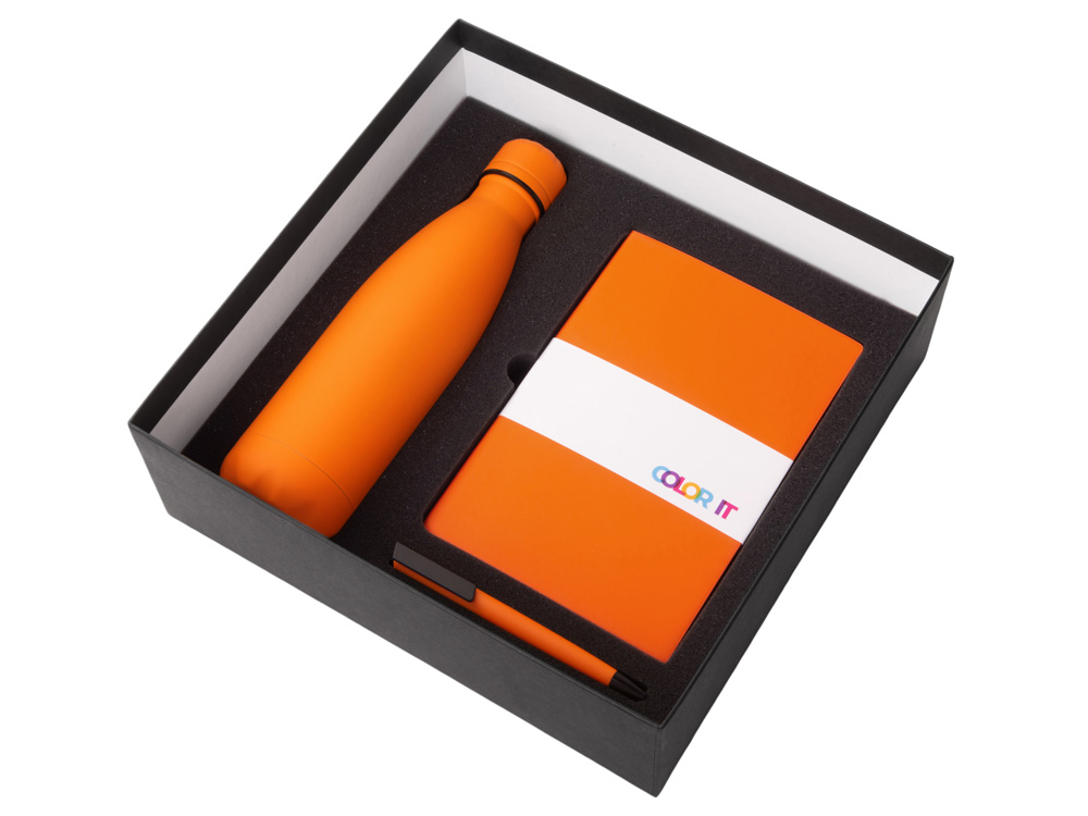 Color It — линейка, в которую входят хиты мерча в десяти самых популярных цветах. Еще никогда собрать сет под свой брендбук не было так просто. Широкая цветовая палитра серии позволяет создать идеальный набор в едином оттенке Pantone. Все товары имеют тактильно приятное покрытие софт-тач. Сет поставляется в коробке: мы продумали все, включая подарочную упаковку, за вас — осталось нанести лого! Классическая форма термобутылки сочетается с продуманной и технологичной конструкцией: вакуумная теплоизоляция и двойные стенки бутылки обеспечивают качественное сохранение температуры напитка до 24-х часов! Блокнот имеет твёрдую обложку и 256 страниц в линейку, даты не указаны, что позволяет начать вести блокнот в любой удобный день года. На нахзаце расположен карман для мелочей. Ляссе окрашено в тон обложки. На обложке блокнота есть магнитный держатель для металлических ручек. Тонкое письмо ручки обеспечивается пишущим узлом с толщиной письма 0,5 мм с нажимным механизмом. - бумага соответствует стандартам FSC; - софт-тач покрытие на всех предметах набора; - объём бутылки: 500 мл; - подарочная упаковка с дизайнерской бумагой уже включена в набор.