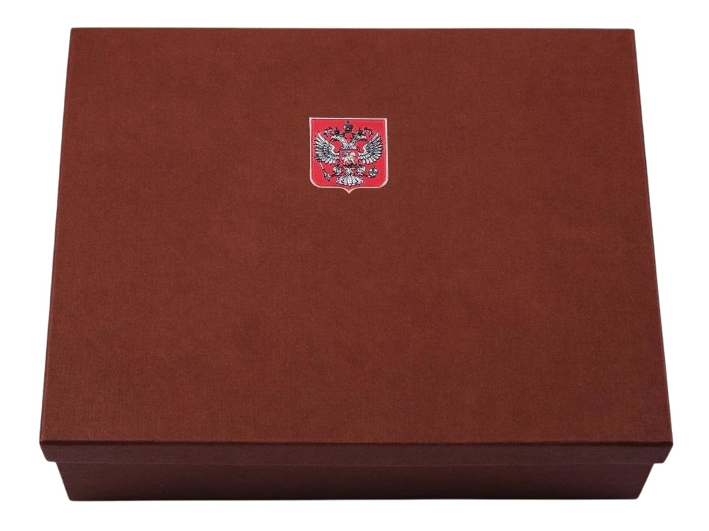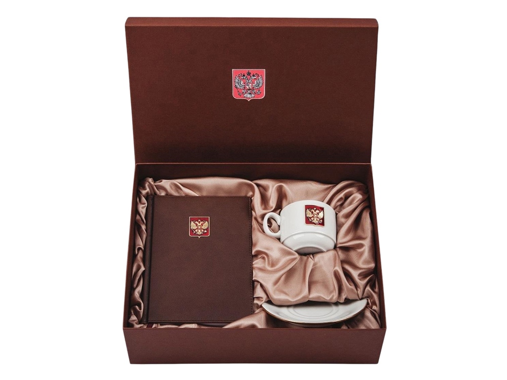 Подарочный набор с ежедневником и чайной парой. Ежедневник формата А5 с декором Герб РФ на щите и фарфоровая чайная пара с золотой отводкой края чашки и блюдца декорированная металлическим барельефом Двуглавый орел. Материал барельефа сплав алюминия с декоративным покрытием под серебро и отделкой эмалью, материал ежедневника кожзам. Емкость чашки 220 мл. Ручная работа. Подарочная упаковка.