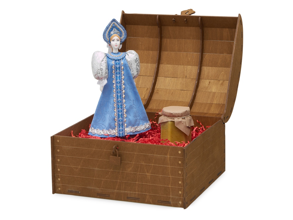 Очарование русских традиций, домашнего уюта и изысканных вкусов соединилось в этом уникальном подарке. Набор создан для тех, кто ценит подлинную красоту и желает подарить незабываемые эмоции. Что внутри: - Фарфоровая кукла в народном костюме ручной работы: расписной сарафан и кокошник с традиционной вышивкой воссоздают образ русской красавицы. - Крем-мёд с лаймом и имбирём (250 г): нежная текстура с яркой цитрусовой ноткой и тёплым имбирным оттенком. Изысканное лакомство для истинных гурманов. - Элегантное оформление: декоративная стружка придаёт композиции глубину и благородство, бережно сохраняя все элементы набора. Роскошная упаковка: деревянный сундук с изящным замочком превращает вручение подарка в особый ритуал. Дополнительное брендирование шильдом спектрум делает презент эксклюзивным и памятным. Идеальный выбор для тех, кто ищет не просто сувенир, а настоящее произведение искусства с русской душой.