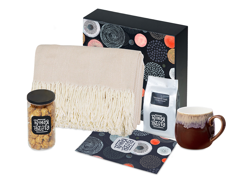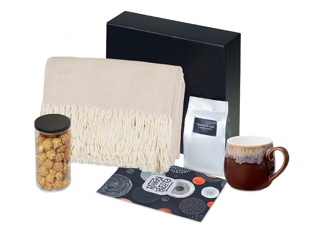 | Материал товара | плед - 100% хлопок, кружка - костяной фарфор с покрытием софт-тач, чай - пластик, попкорн - пластик, металл, мешок - нетканый материал (спанбонд), коробка - картон |