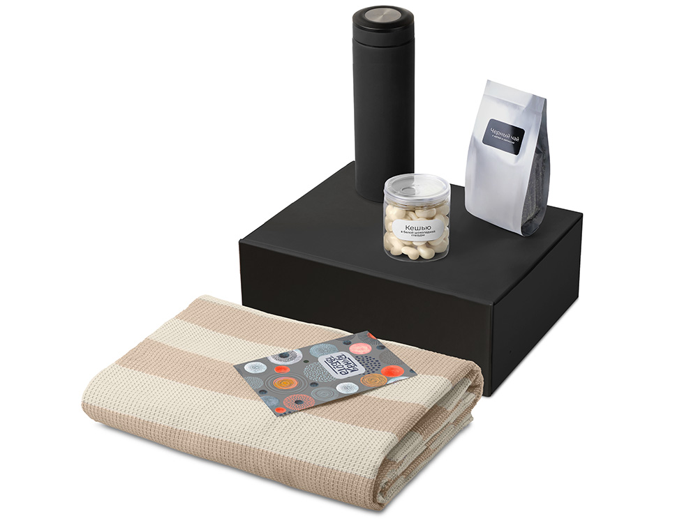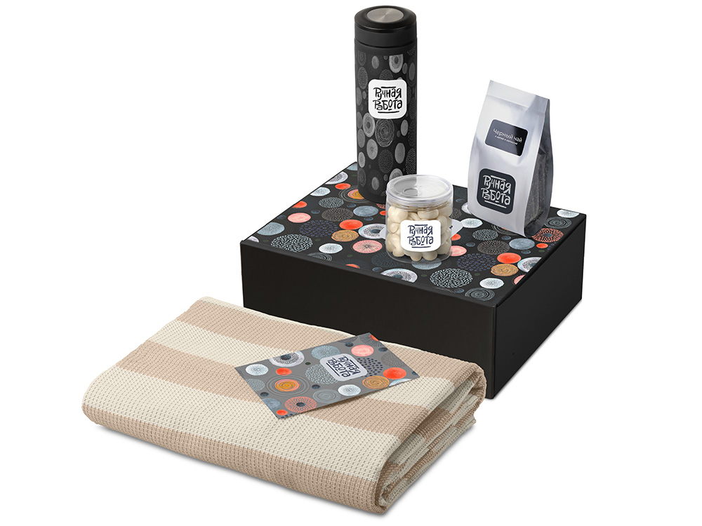 | Материал товара | плед - 100% хлопок, термос - нержавеющая сталь с покрытием софт-тач, чай - пластик, мешок - нетканый материал (спанбонд), коробка - картон |