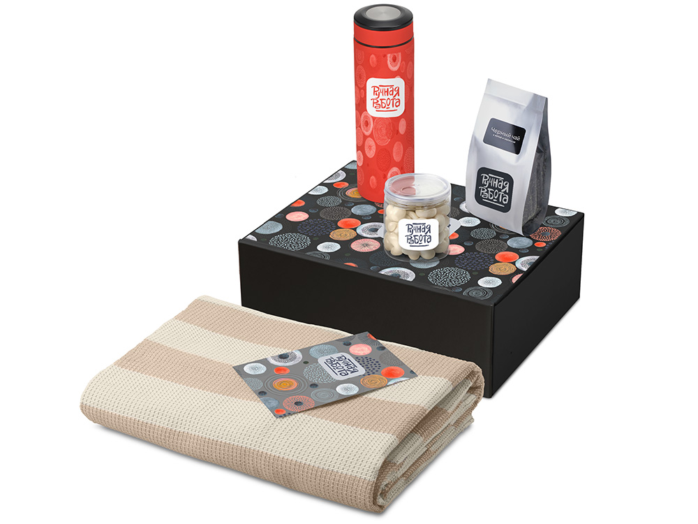 | Материал товара | плед - 100% хлопок, термос - нержавеющая сталь с покрытием софт-тач, чай - пластик, мешок - нетканый материал (спанбонд), коробка - картон |
