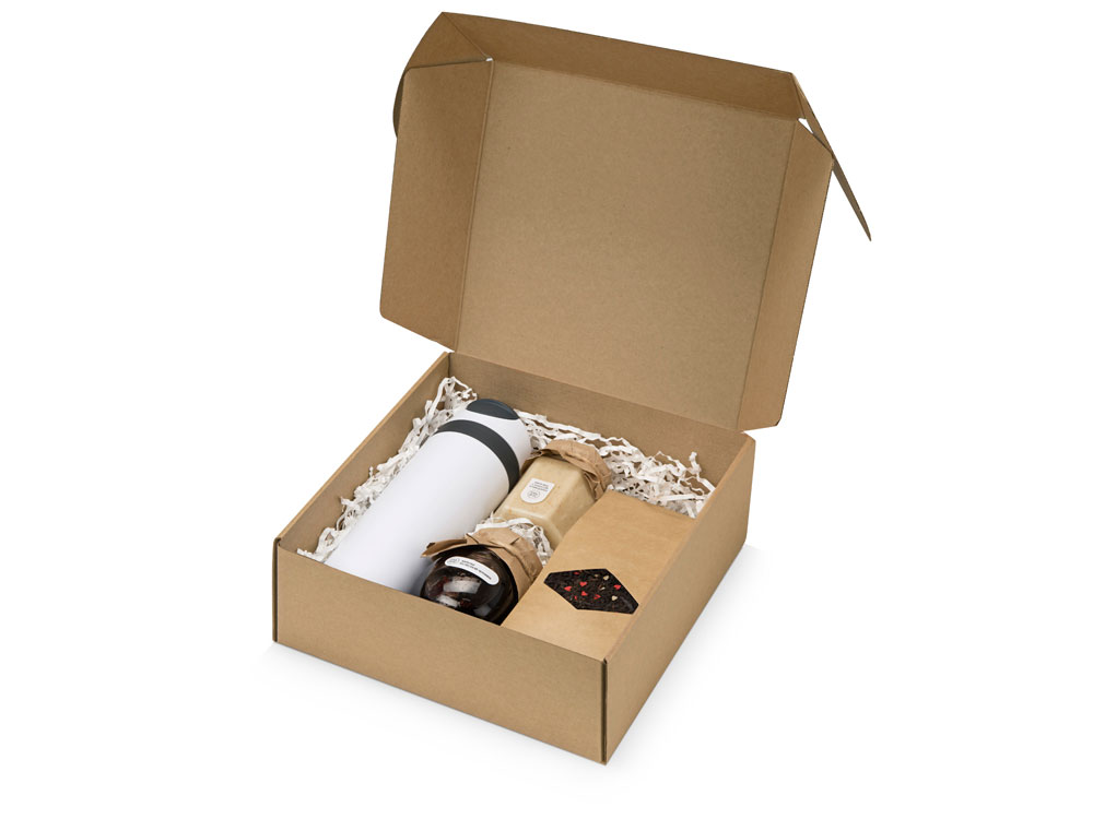 Набор состоит из термокружки, баночки крем-мёда с кокосом и миндалём, варенья из сосновых шишек, чёрного чая. Набор упакован в крафтовую картонную коробку с бумажным наполнителем.