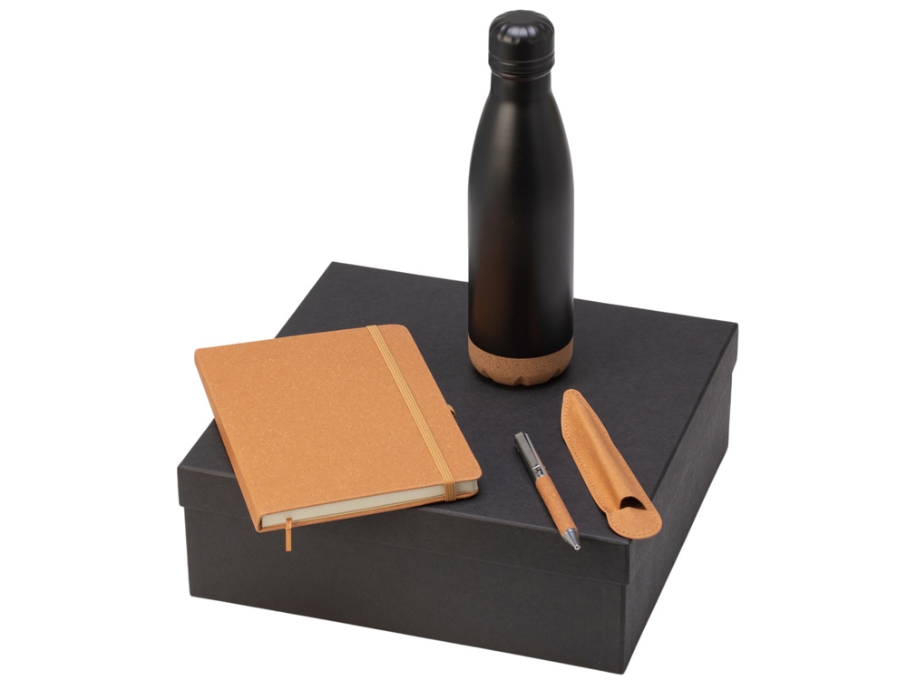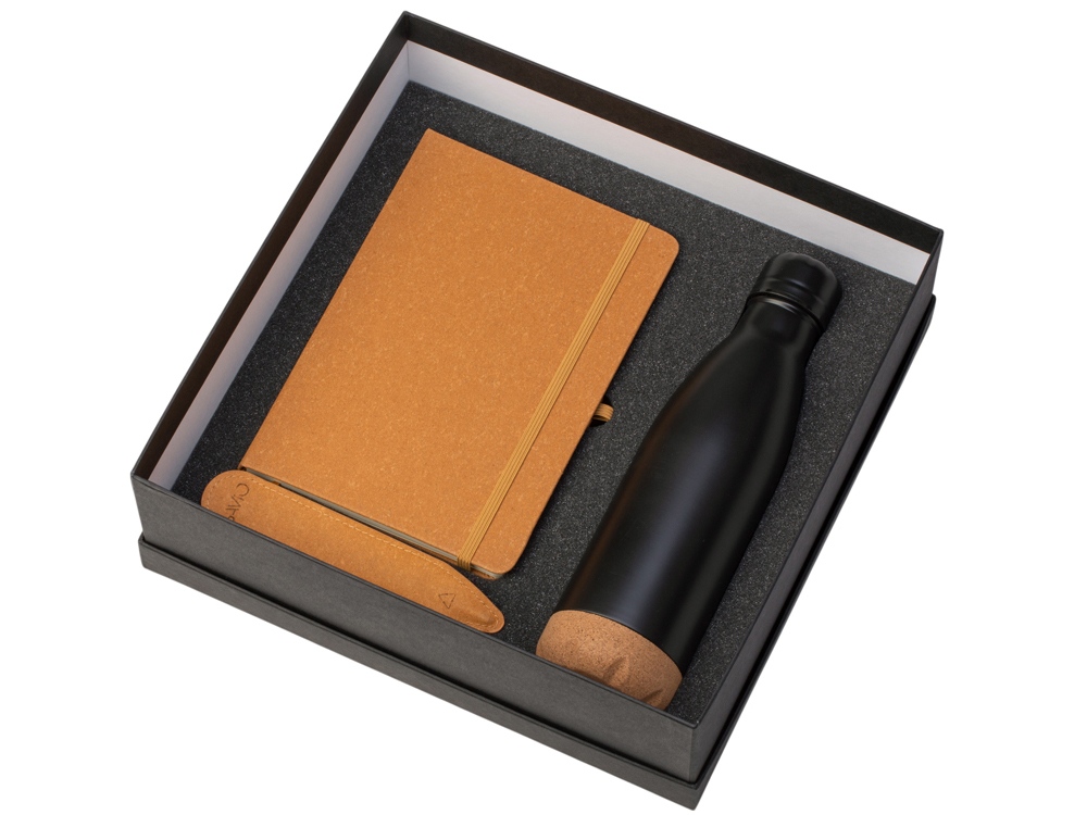 Набор из блокнота, ручки и бутылки для воды - идеальный вариант для подарка сотрудникам или клиентам. Термобутылка имеет медный слой между стенками, который позволяет ей удерживать температуру до 24 часов. Нижняя часть бутылки выполнена из экологичной пробки, которая не даёт скользить по столу или царапать его. Блок блокнота - бежевого цвета с линовкой в линейку. Твёрдая обложка выполнена из переработанной кожи, как и вставка на ручке. Ручка изготовлена из переработанной стали и оснащена стержнем с эко-чернилами, при производстве которых не выделяется вредных веществ. объём термобутылки: 460 мл; блокнот с резинкой; мерч с заботой об экологии.
