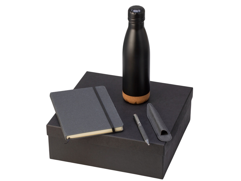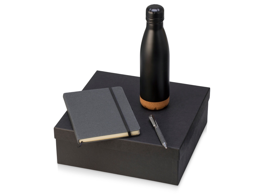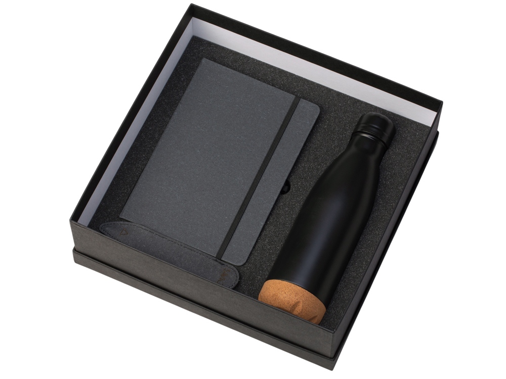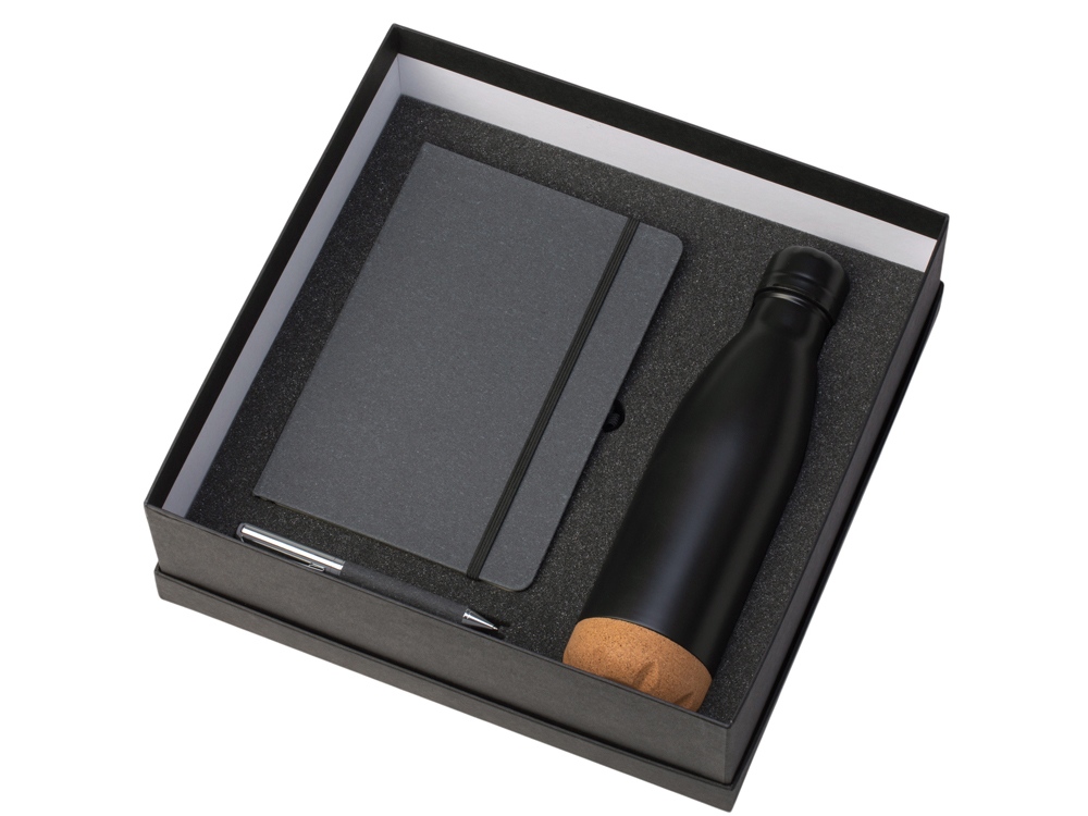 Набор из блокнота, ручки и бутылки для воды - идеальный вариант для подарка сотрудникам или клиентам. Термобутылка имеет медный слой между стенками, который позволяет ей удерживать температуру до 24 часов. Нижняя часть бутылки выполнена из экологичной пробки, которая не даёт скользить по столу или царапать его. Блок блокнота - бежевого цвета с линовкой в линейку. Твёрдая обложка выполнена из переработанной кожи, как и вставка на ручке. Ручка изготовлена из переработанной стали и оснащена стержнем с эко-чернилами, при производстве которых не выделяется вредных веществ. объём термобутылки: 460 мл; блокнот с резинкой; мерч с заботой об экологии.